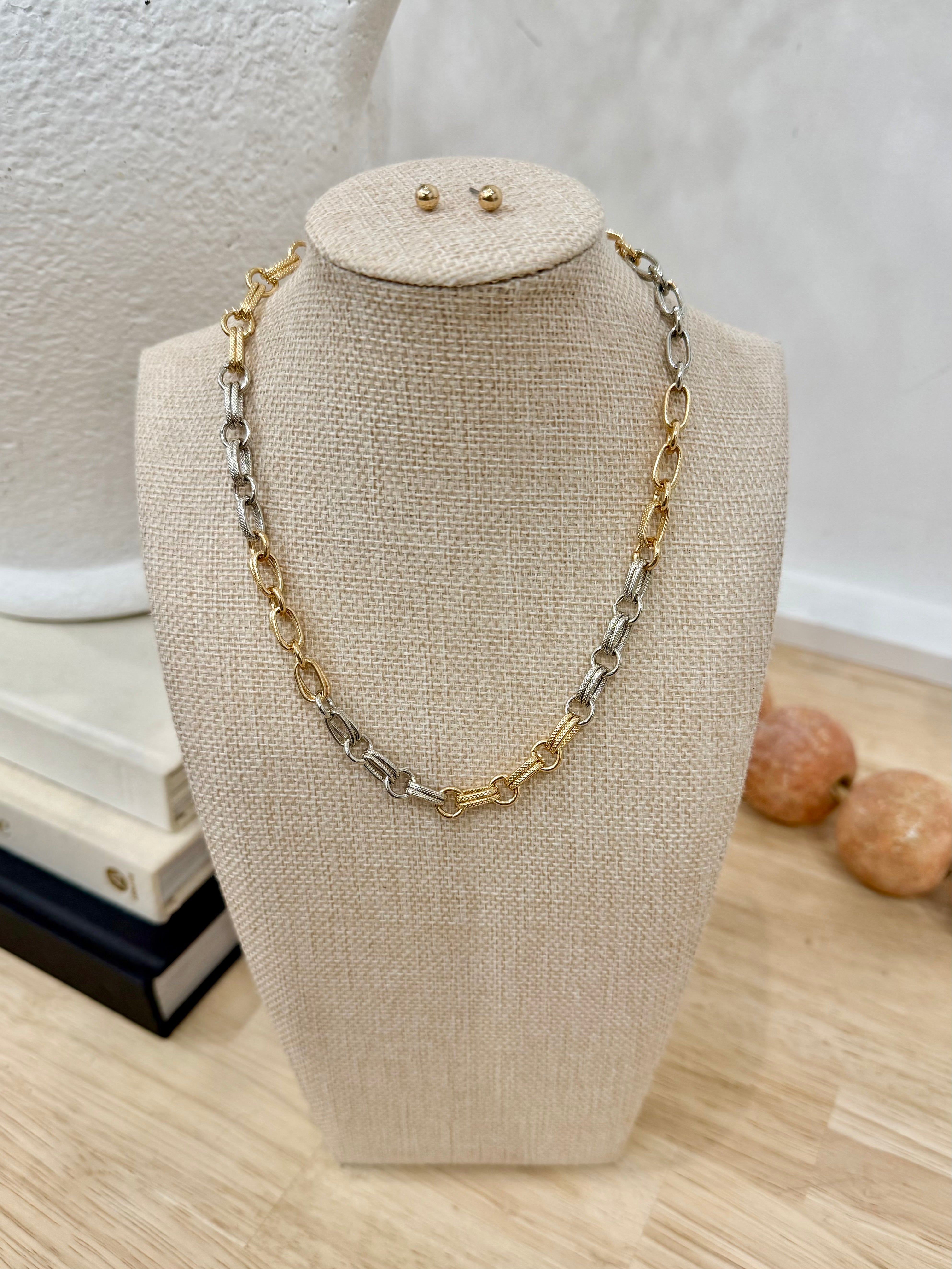 The Alana Link set pairs a gold and silver chain with polished gold studs for a modern, versatile look. Sleek and sophisticated, it’s perfect for layering or wearing alone as a subtle statement piece.