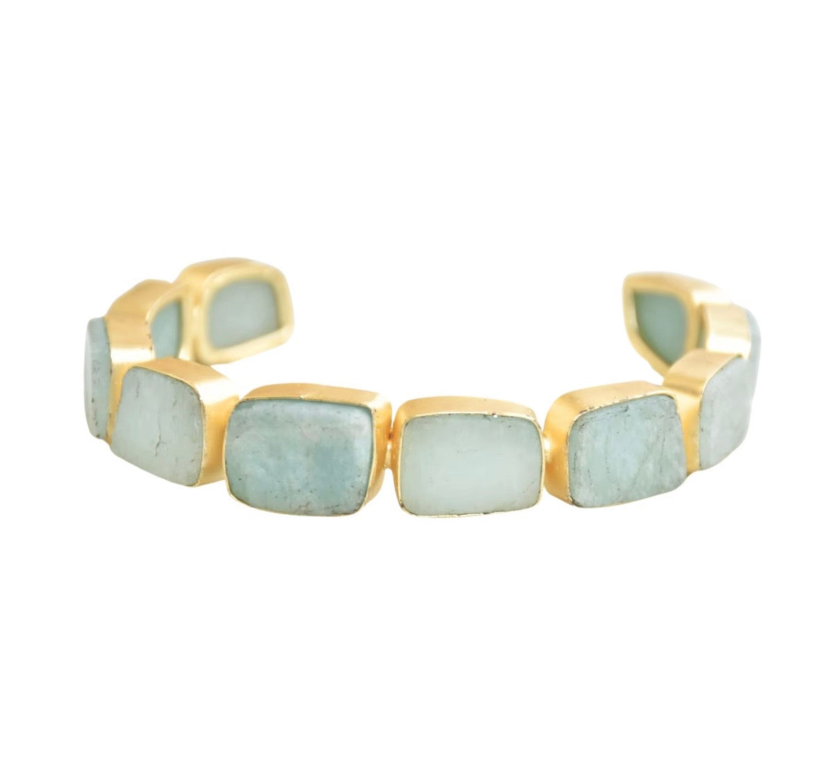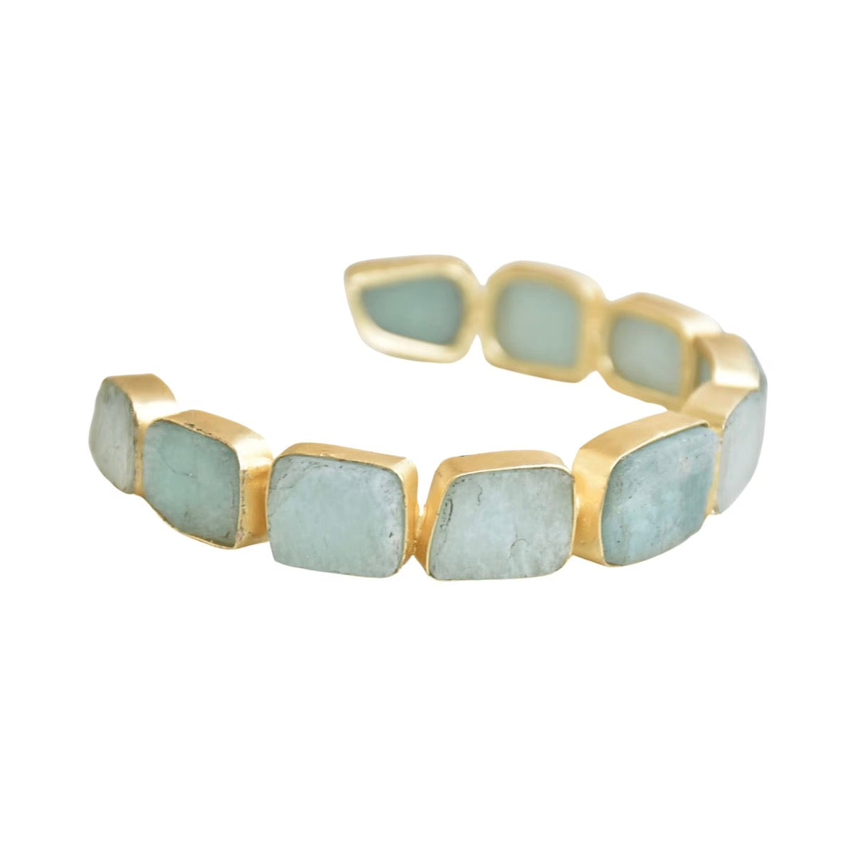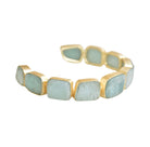 Elevate your look with the Amazonite Cuff bracelet, crafted with 18-karat gold plating for a radiant, lasting shine. Featuring striking amazonite stones in a refined bezel setting, each piece is securely framed to highlight its soft blue-green hues and natural beauty. The open cuff design offers a comfortable, adjustable fit—making it a timeless accessory perfect for both everyday wear and special occasions.