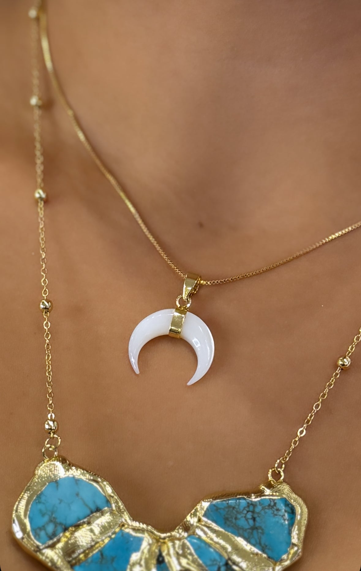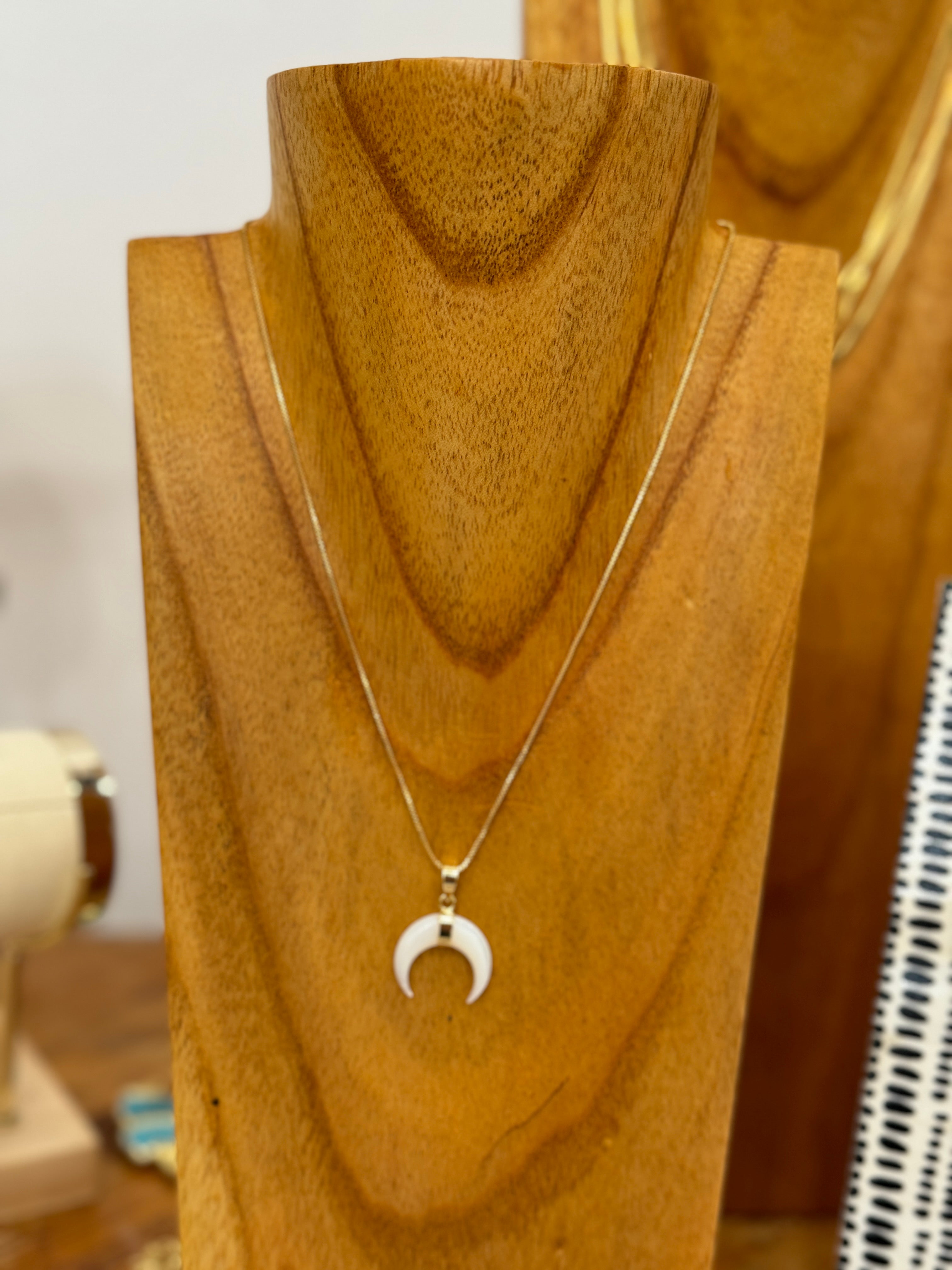 Featuring a stunning 18k plated mother of pearl horn pendant, this necklace is adjustable to 18-20 inches in length, making it the perfect addition to any layered or solo look.