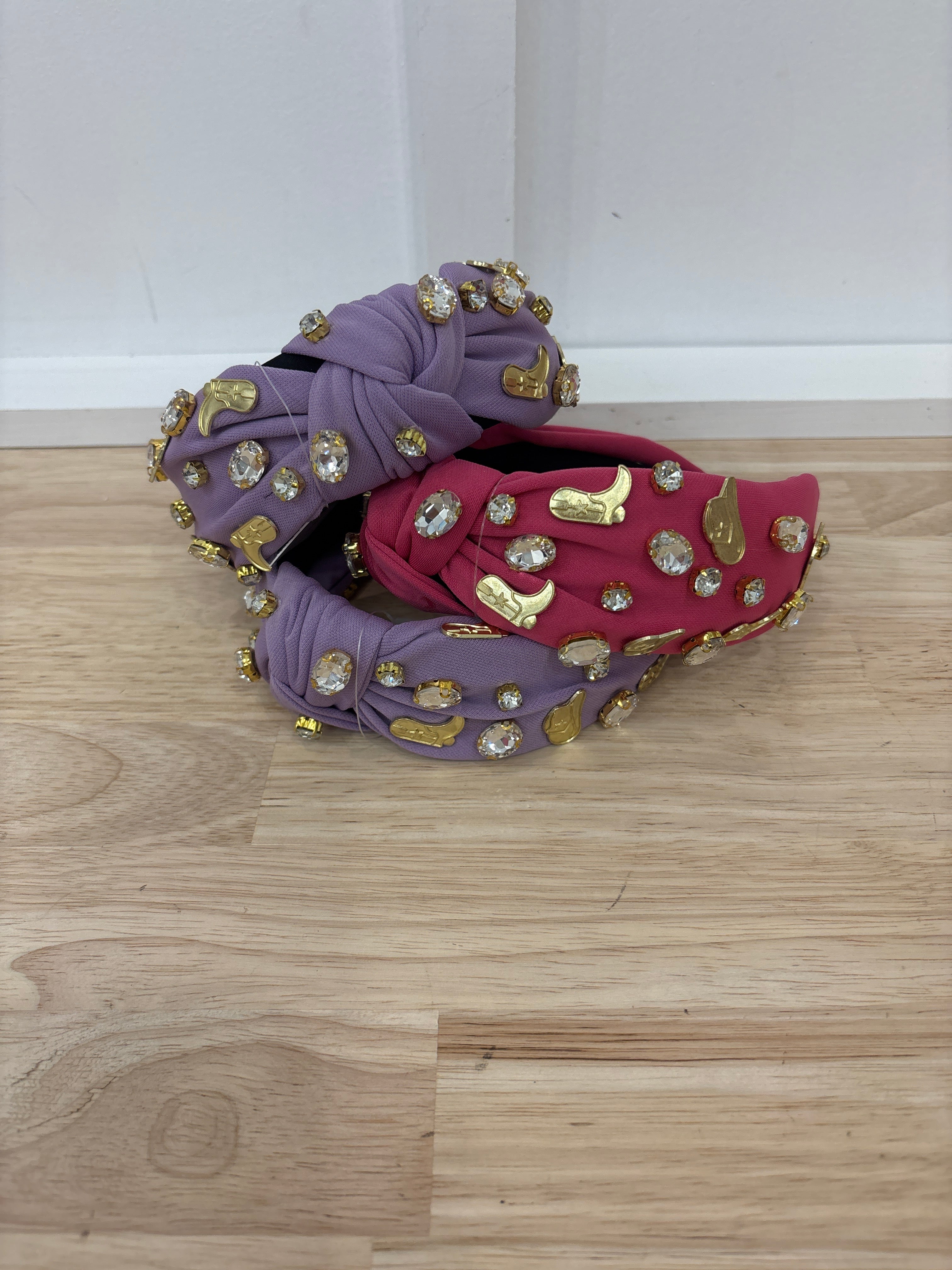 These fun headbands boast a luxurious satin lining, decked out with glittering rhinestones and accented with golden cowboy boots and hats.