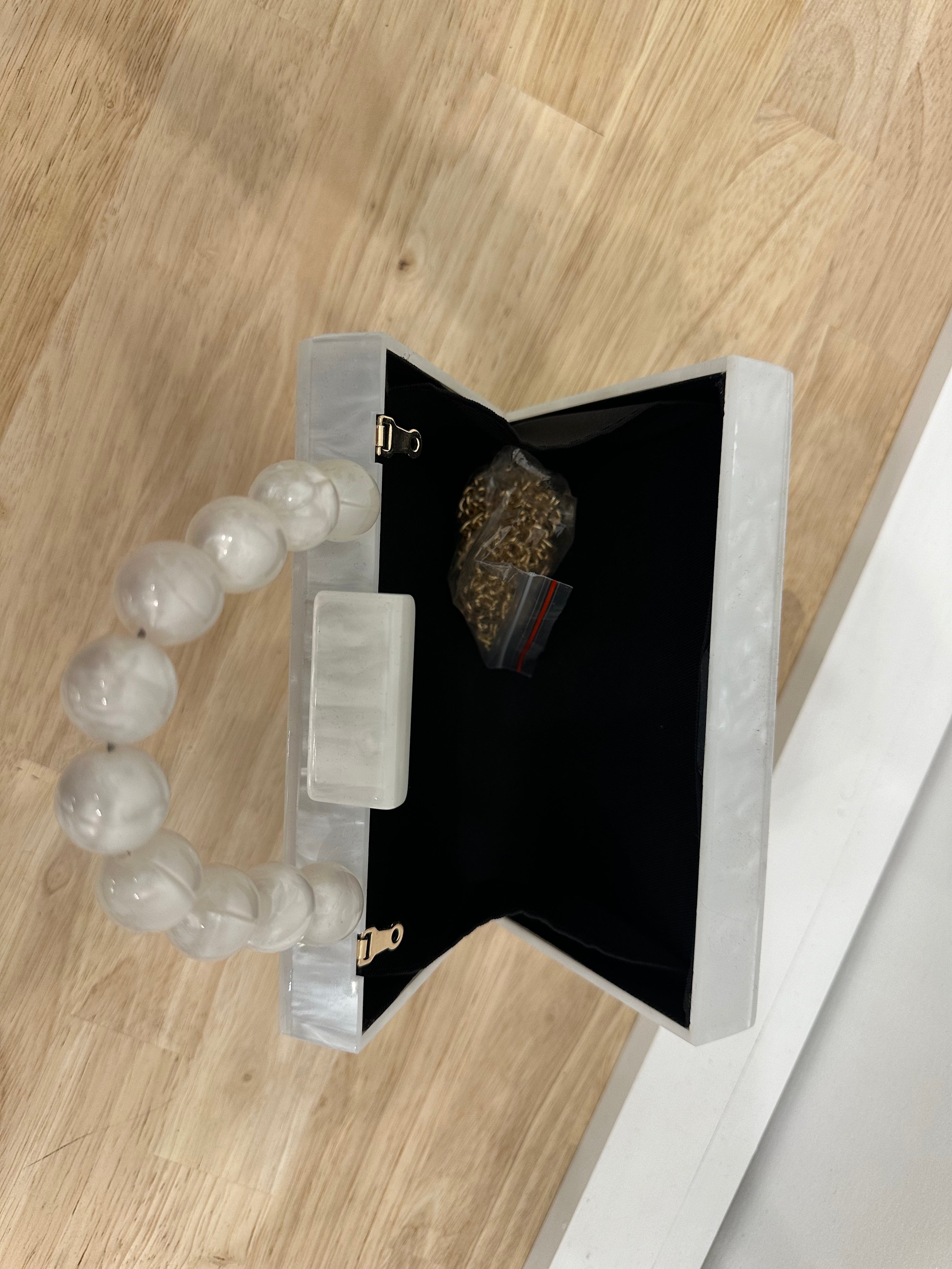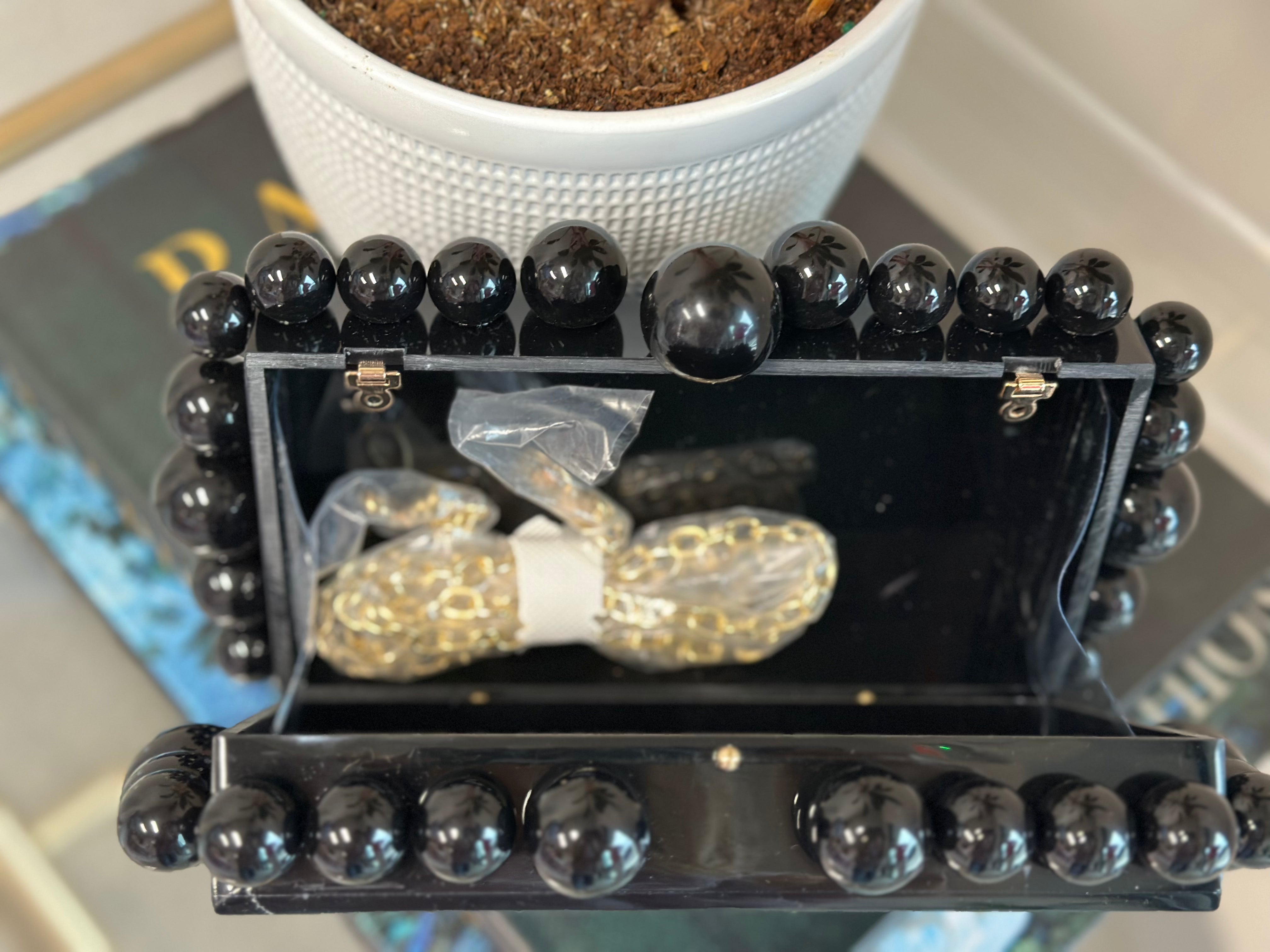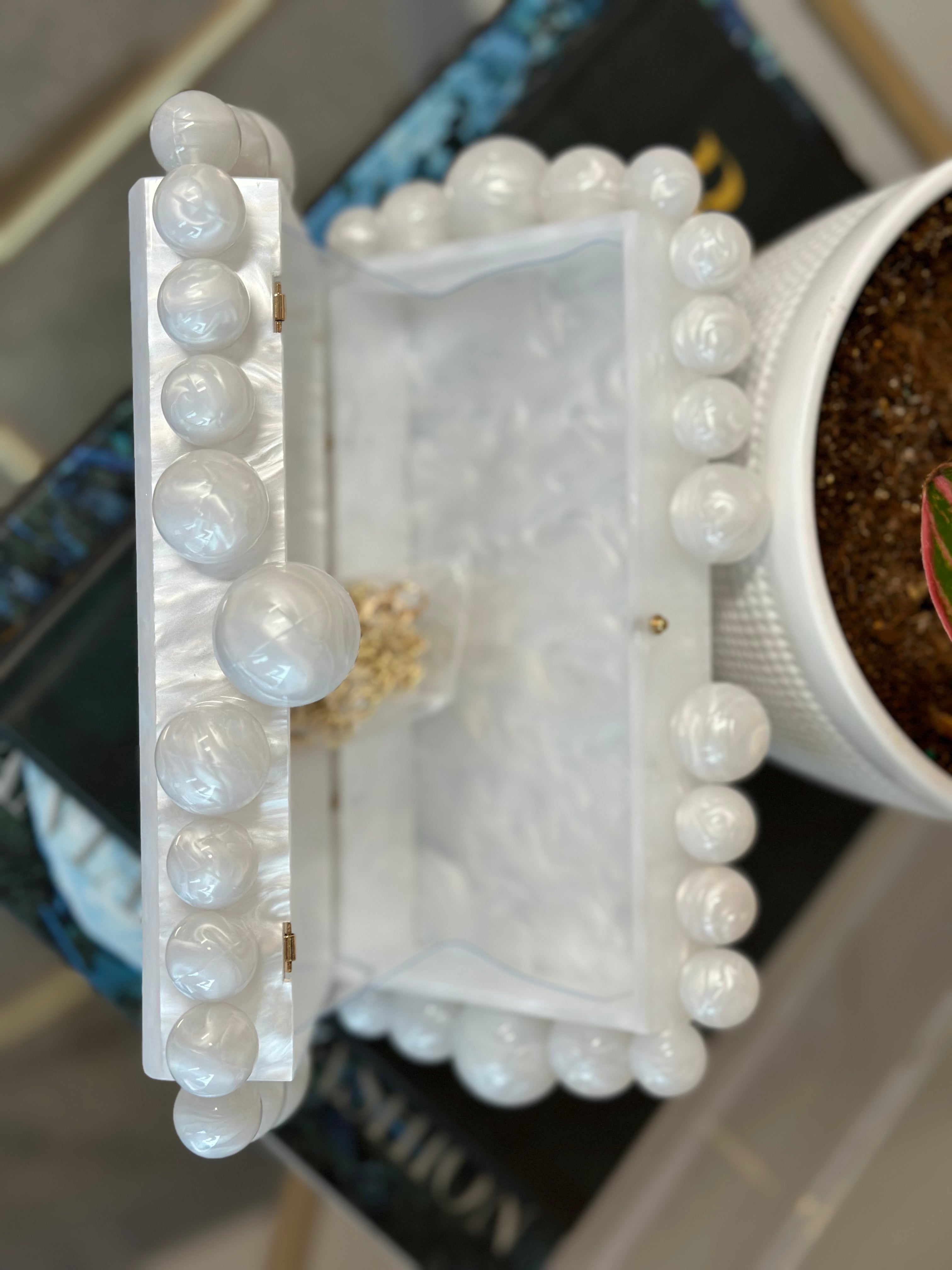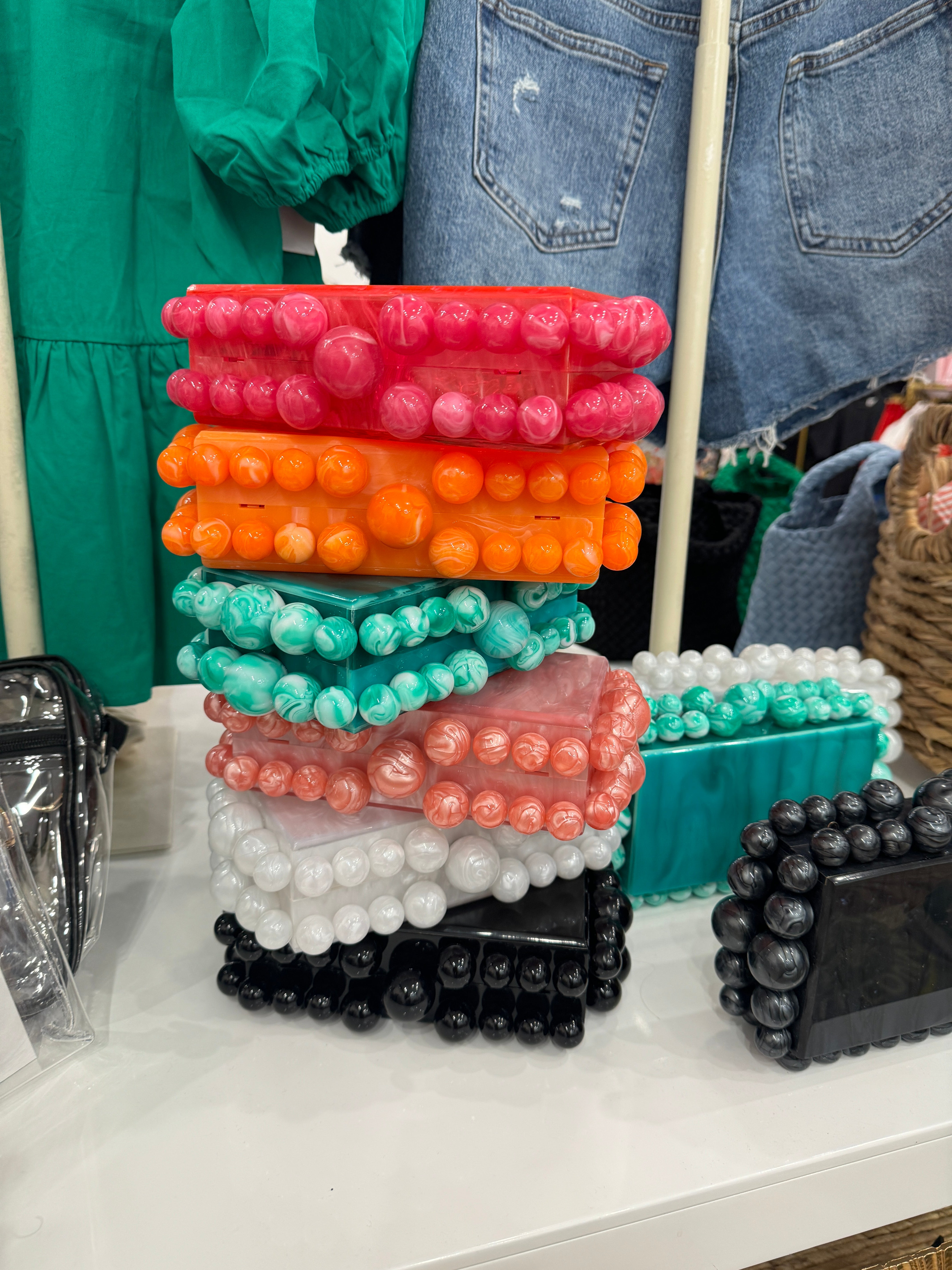 Enhance your outfit with our Bubble Acrylic Purse. This rectangle hard acrylic clutch features a detachable gold chain, offering versatility as a crossbody bag. Elevate your style with this sleek and functional accessory.