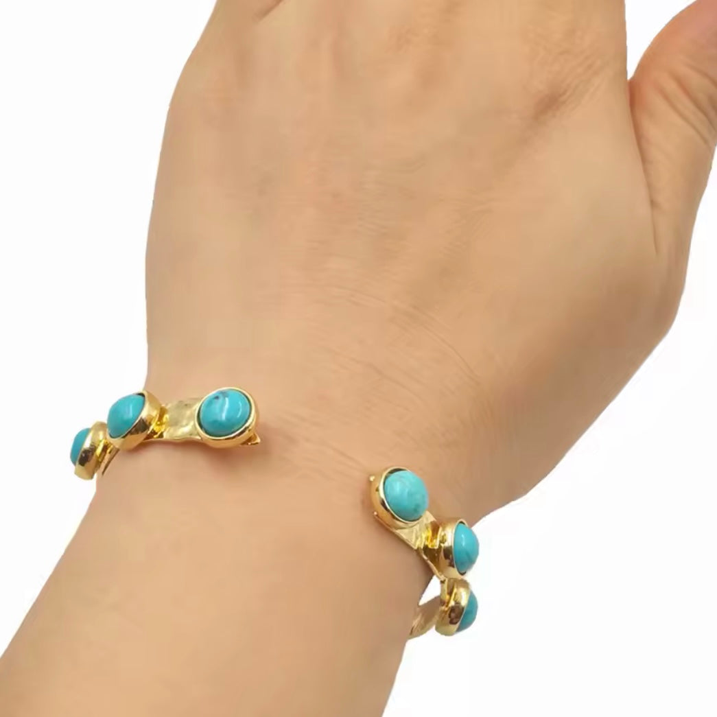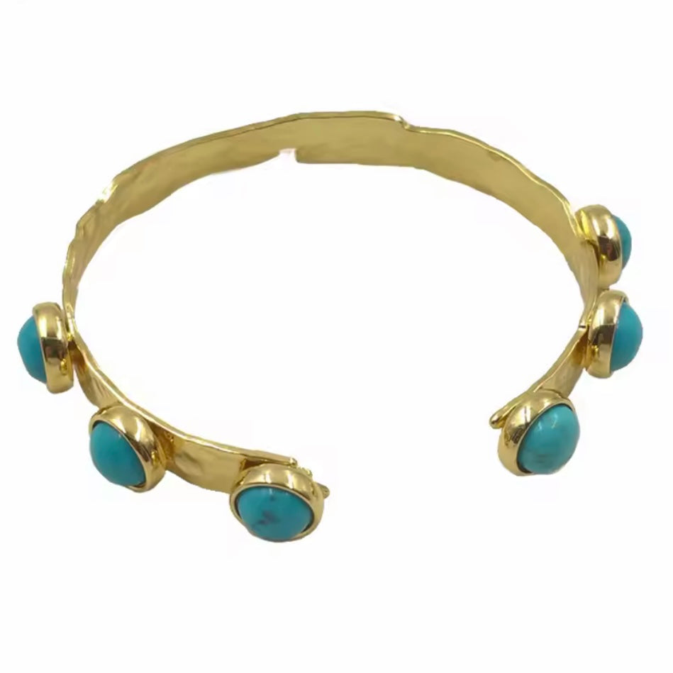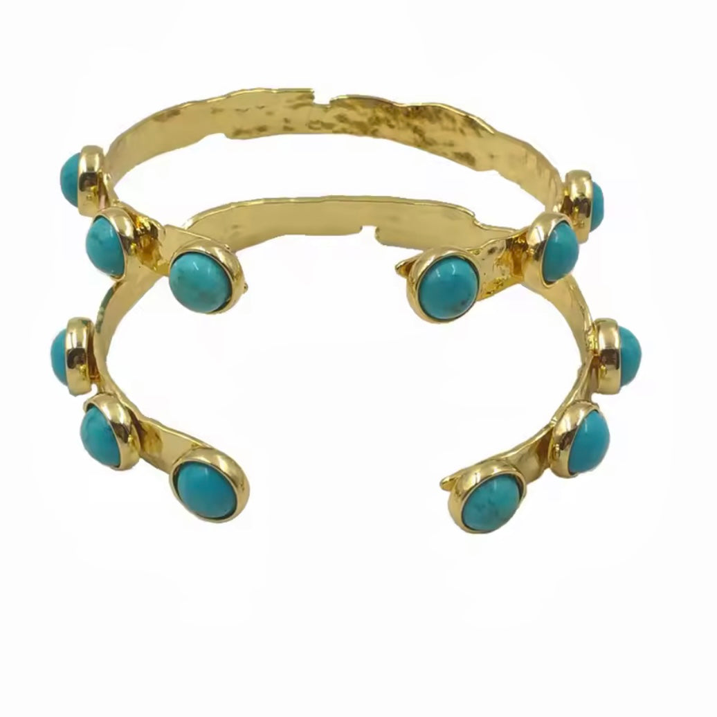 Crafted with precision and elegance, the Turquoise Hammered Gold Cuff is a must-have accessory. The cuff features a stunning 18k gold plating, adding a touch of luxury and sophistication to any outfit. Elevate your style game with this timeless piece.