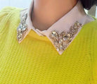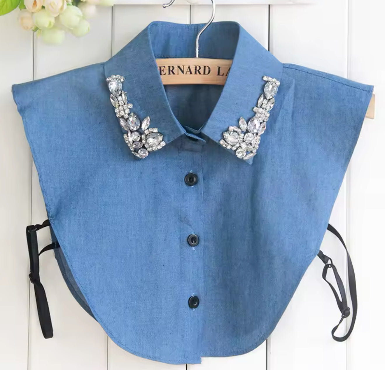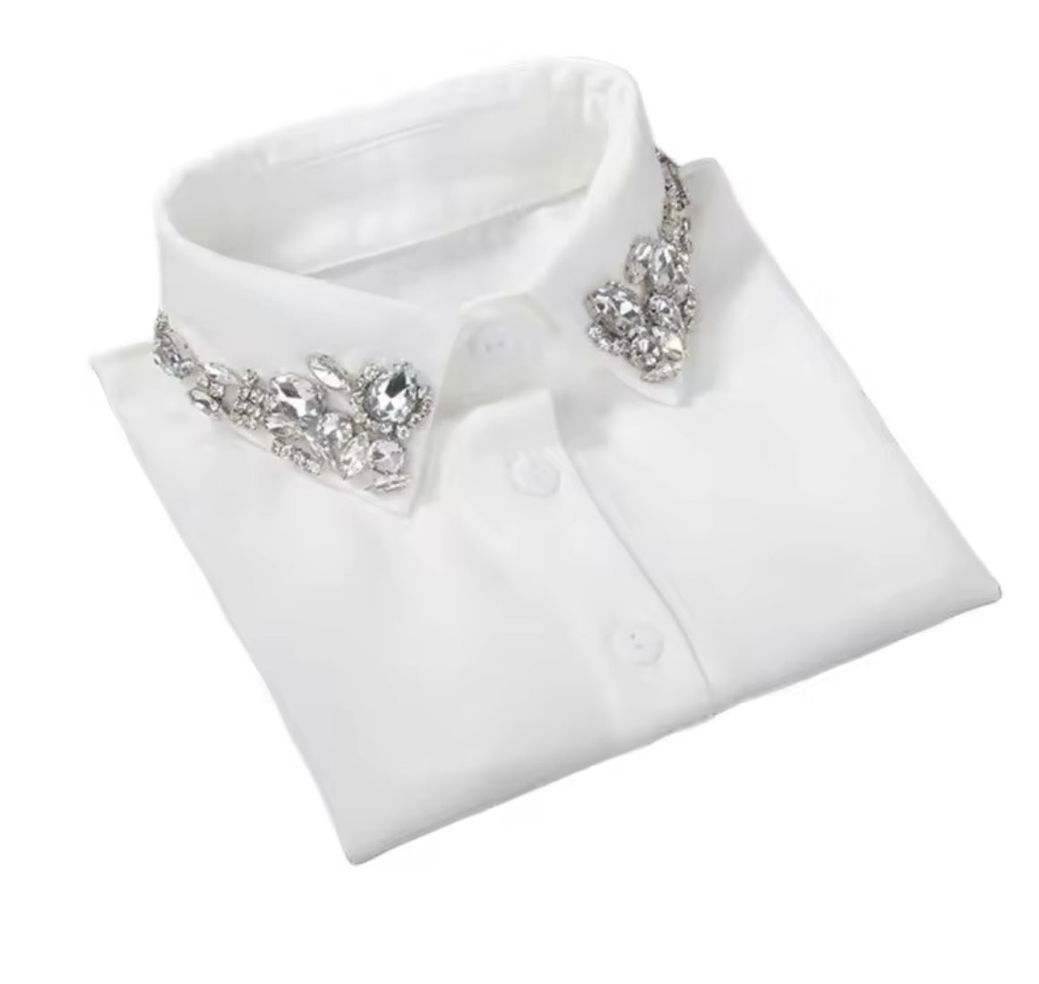 This ladies' fake collar is the perfect accessory to add a touch of elegance to any outfit. Made with water drop imitation crystals and chiffon fabric, it features rhinestone lapels and detachable buttons for easy customization. Enhance your wardrobe with this beautiful and versatile piece.