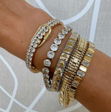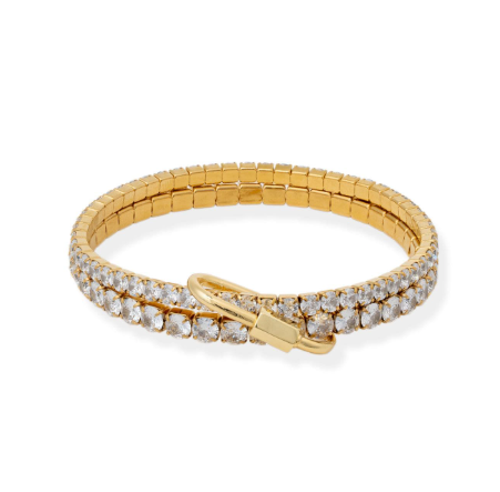 The Elara Stretch Bracelet features dazzling cubic zirconia stones and a gold-filled carabiner clasp that secures the design with a contemporary touch. Its stretch fit offers comfortable wear, making it an elegant standalone piece or a chic addition to your bracelet stack. This refined accessory effortlessly blends sparkle with modern simplicity.