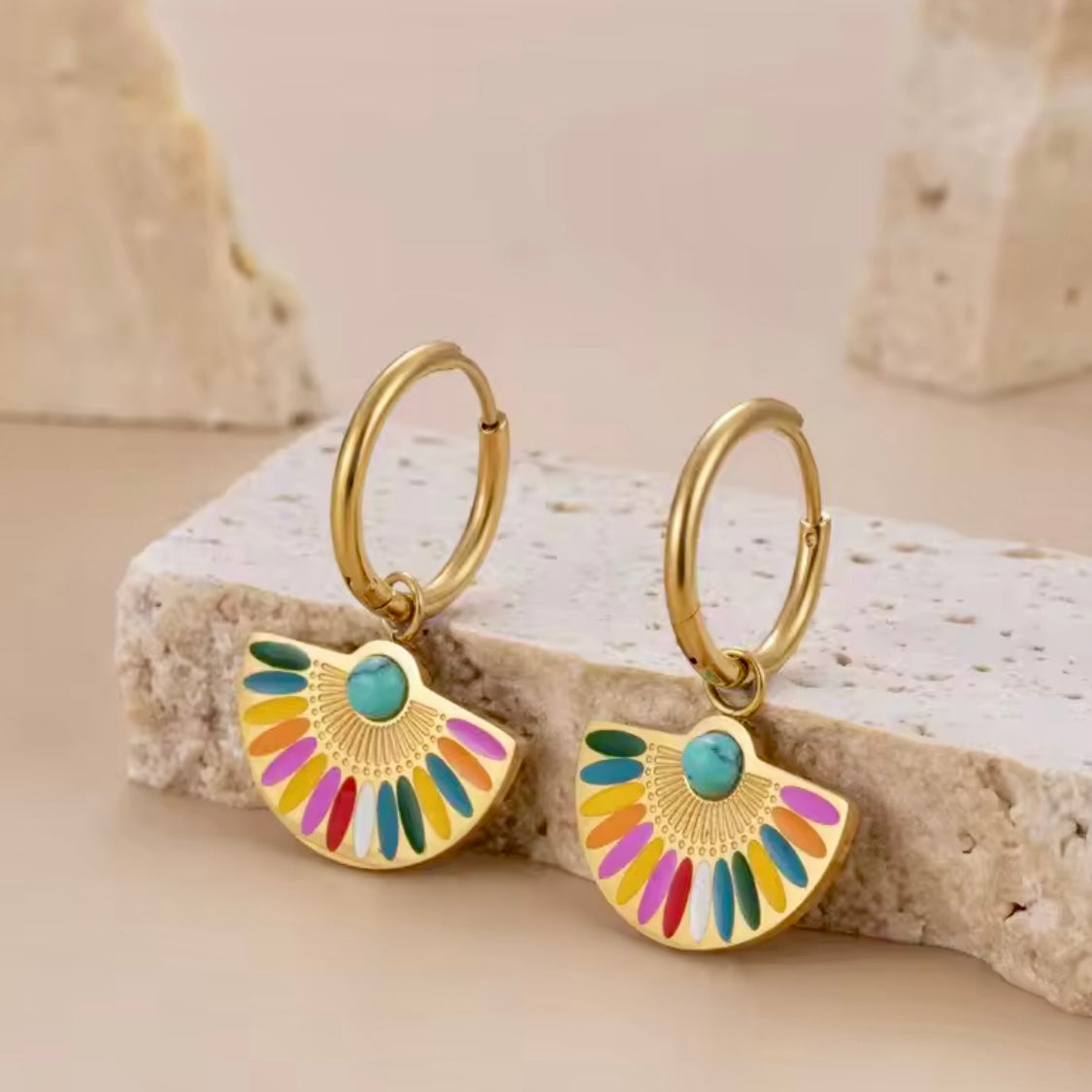 Elevate your look with our versatile Fan Charm Earrings! These colorful earrings are a fun way to add a pop of color to any outfit. Wear as plain hoops or with the fan charm.