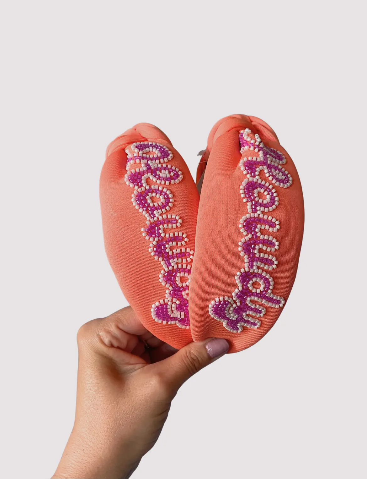 Introducing our Howdy Headband, a stylish coral headband adorned with a beaded "howdy" word. Made for cowgirls and southern fashion enthusiasts, this headband adds a touch of charm to any outfit. Perfect for festivals, parties, or everyday wear, this headband will make you stand out in the crowd.