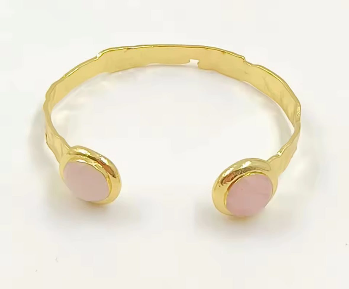 This beautiful gold cuff by Hudson Day is a timeless statement of elegance and simplicity. Designed with a sleek, polished gold band, it features two soft pink round stones that add the perfect hint of color and femininity. The open-ended design makes it easy to slip on and comfortable for everyday wear. Stunning on its own for a refined look or stacked with other Hudson Day pieces for a layered, luxe effect — it’s a must-have accessory that effortlessly elevates any outfit. ✨