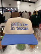 This cute trucker style hat is perfect for showing off your love for Texas. With its baby blue and cream colors, it's a stylish way to express your love for the Lone Star State.