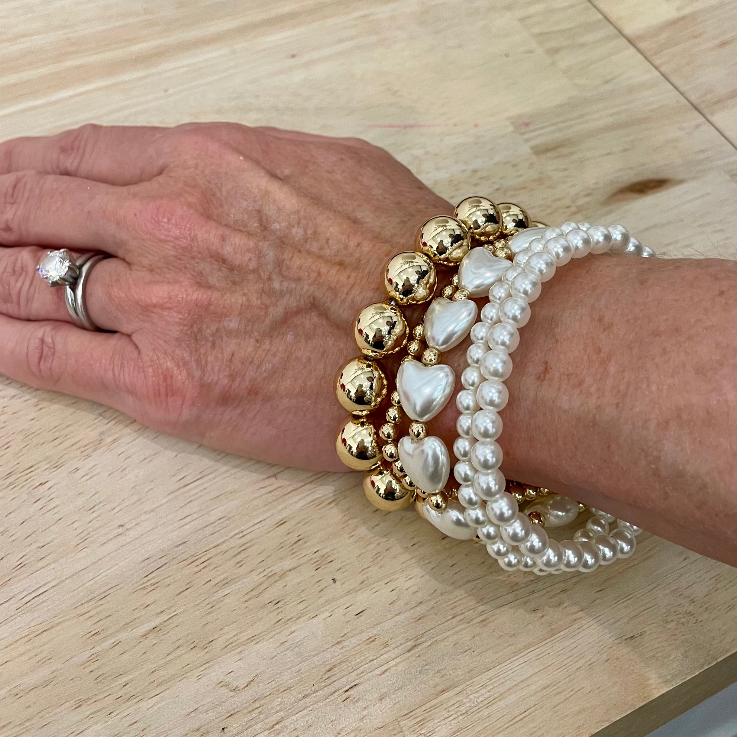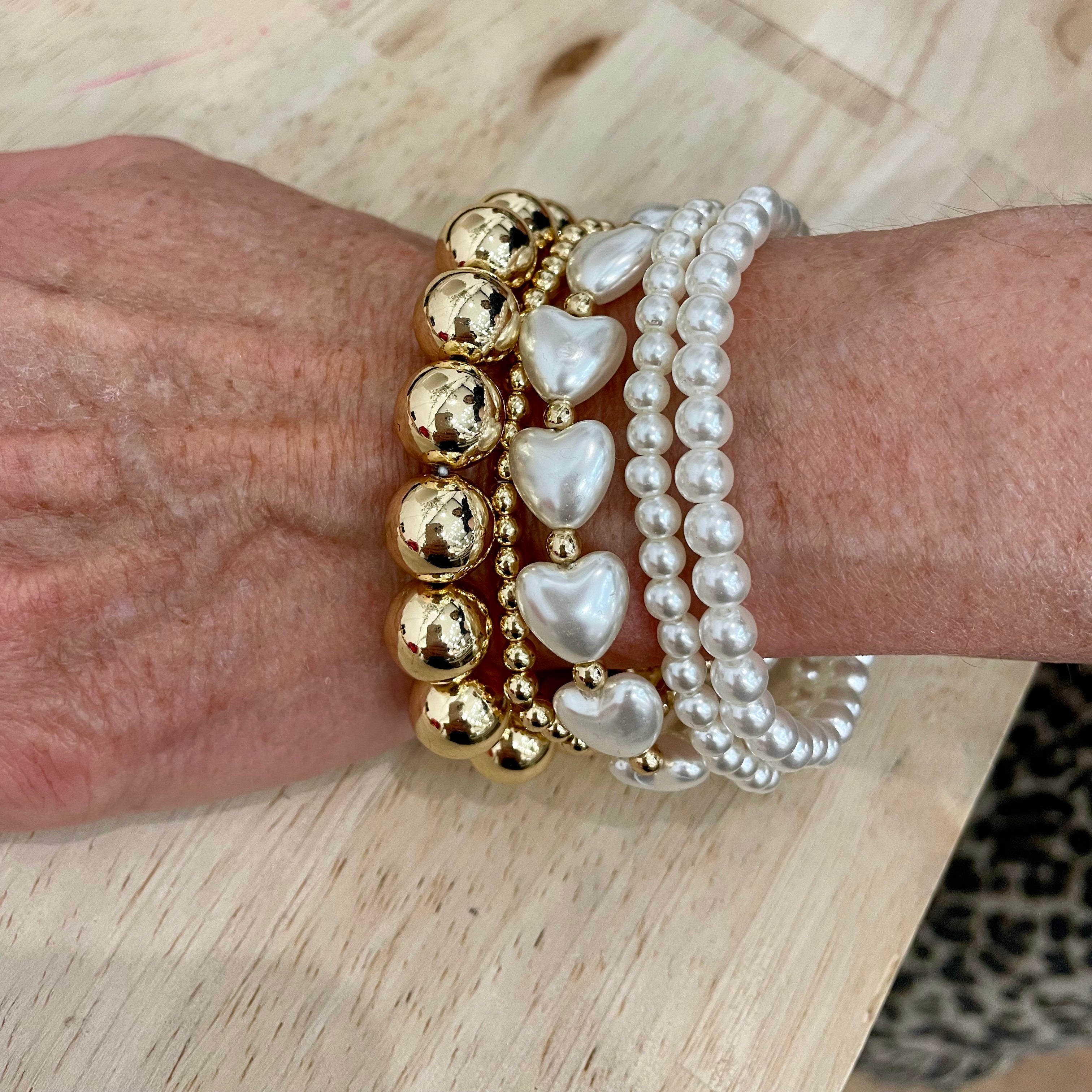 Our new Pearl Heart Bracelet Stack includes five bracelets that can be worn together or separately.