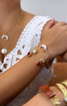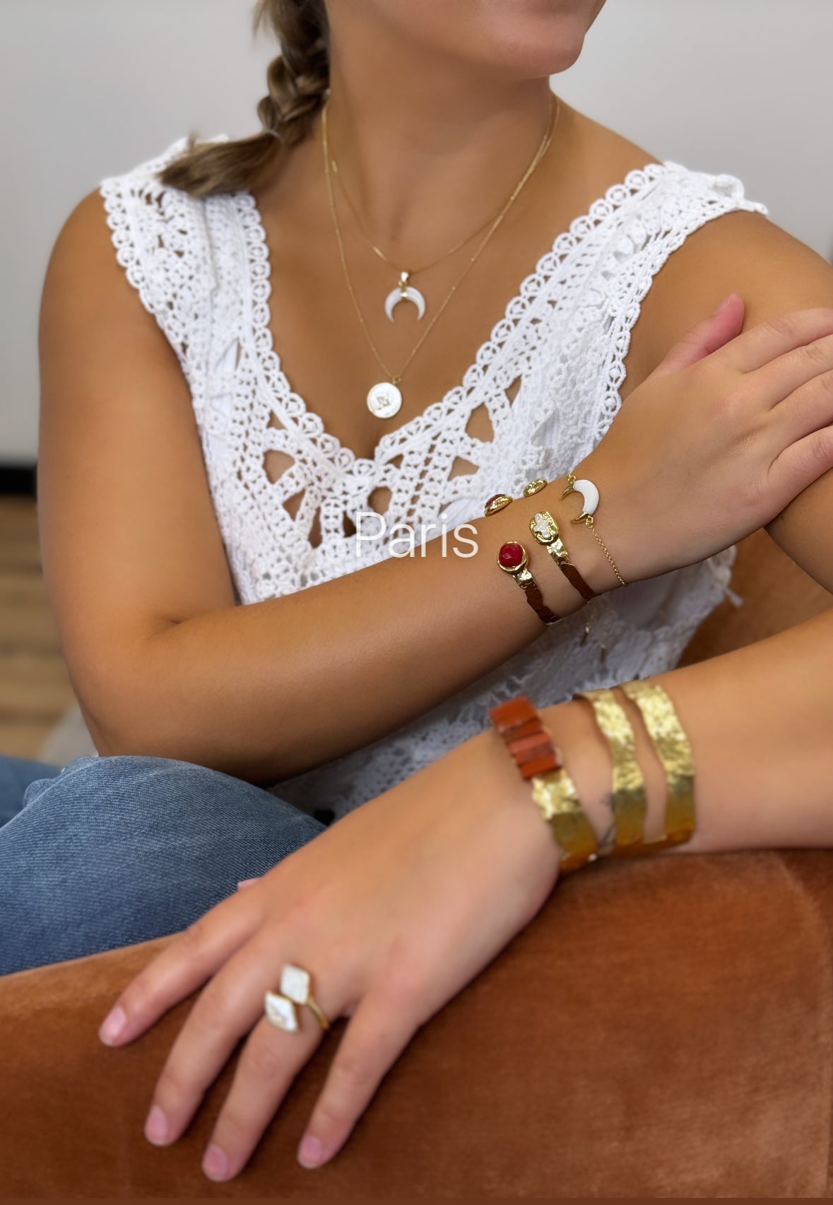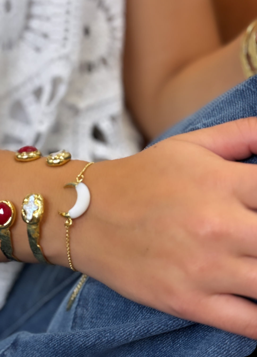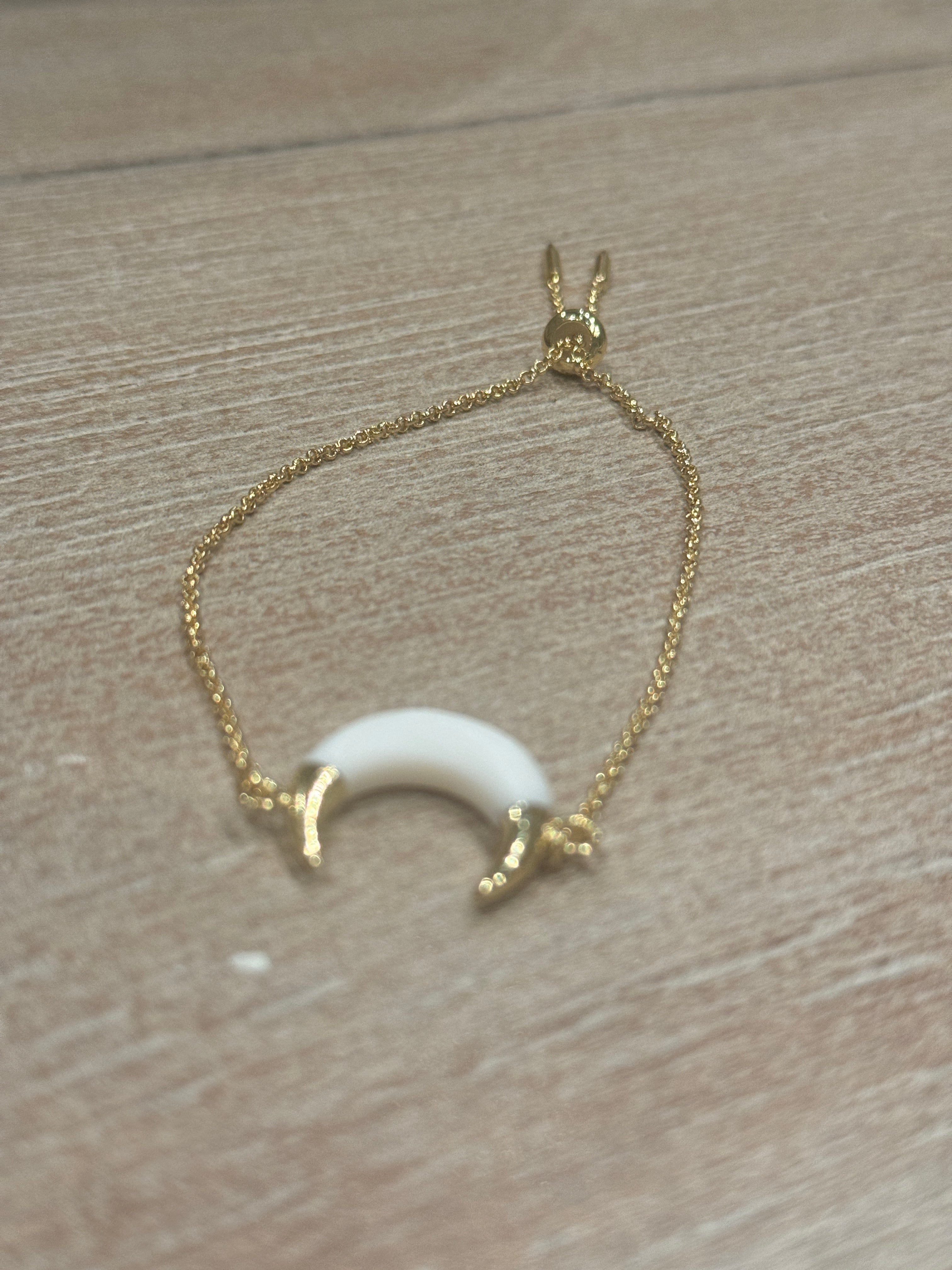 This elegant 18k plates bracelet features a carved mother of pearled crescent horn. The adjustable design allows for versatile styling, whether stacked or worn alone.