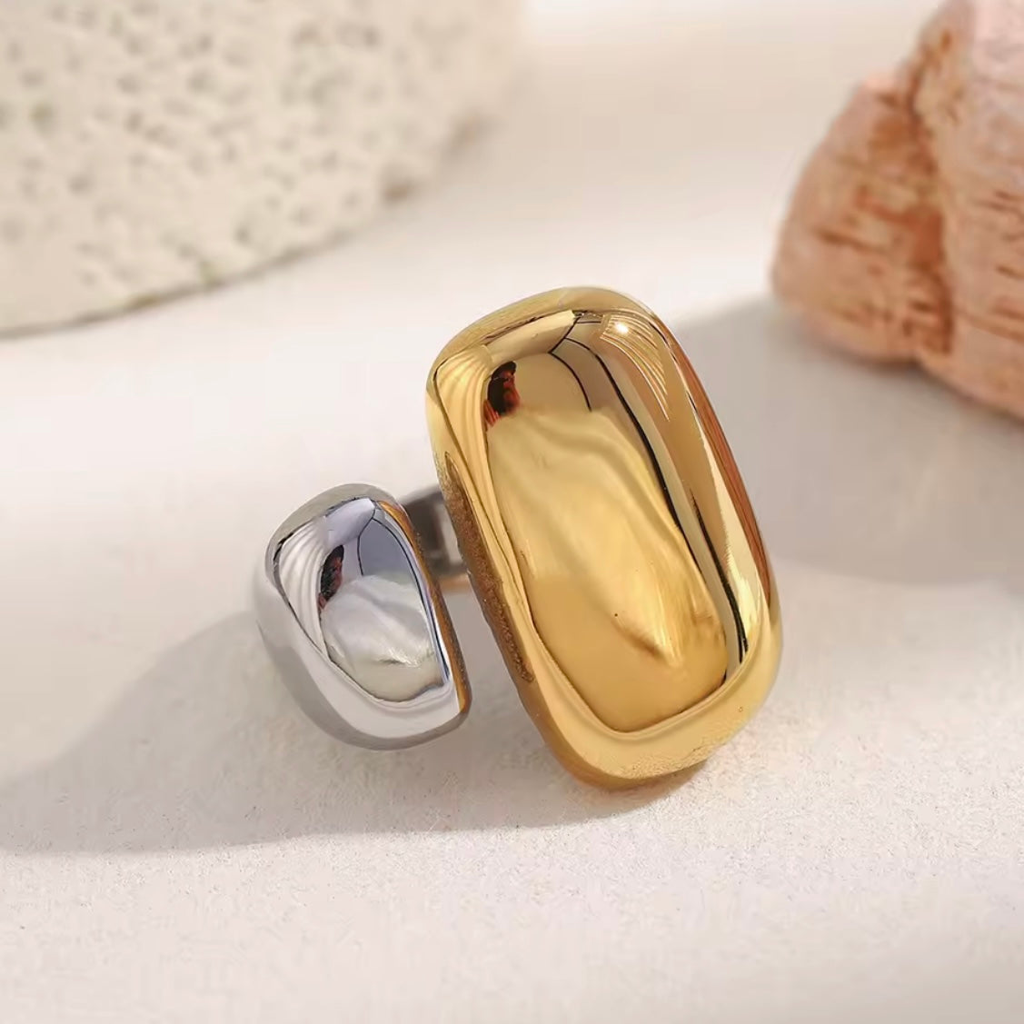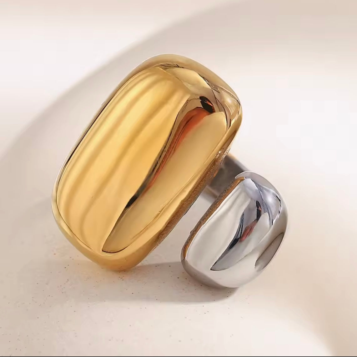 A modern statement with everyday ease. This two-tone wraparound ring is crafted from durable stainless steel, designed to be waterproof, tarnish-resistant, and effortless to wear. Its sleek, open silhouette hugs the finger comfortably, blending contrasting tones for a chic, contemporary finish—perfect for day or night.