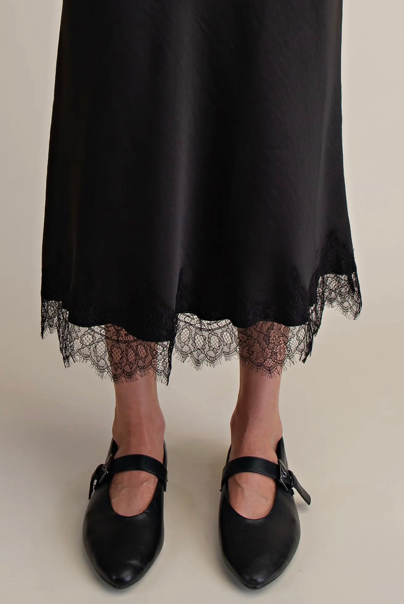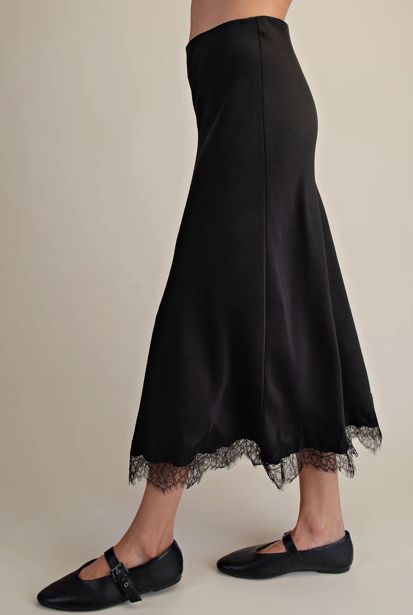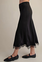 This satin lace midi skirt is pure elegance with a modern edge. Designed with a silky smooth satin base and delicate lace detailing, it drapes beautifully for a flattering, feminine silhouette. The midi length adds effortless sophistication, making it perfect for dressing up or styling casually with a tee or knit. Lightweight with a soft sheen, this skirt moves gracefully with every step—timeless, romantic, and endlessly versatile.