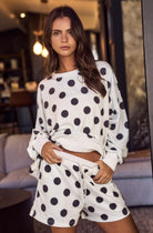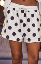 A cute and comfy pair of ivory sweat shorts sprinkled with black polka dots for a playful touch. Designed with a soft, relaxed fit, these shorts feature an elastic waistband with an adjustable tie for all-day comfort and easy wear. Perfect for lounging, running errands, or pairing with the matching sweatshirt, they’re the kind of effortless staple that feels cozy but still looks put-together