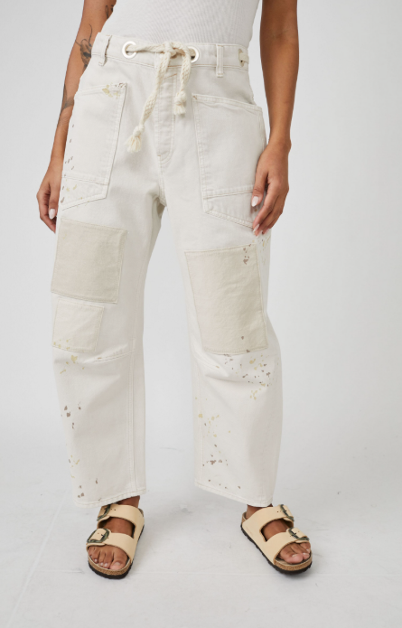 Features: Distressed detailing throughout, paint splatter features, oversized patch pockets, contrast drawstring waist, pull-on style