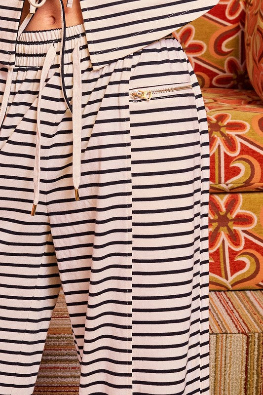 These navy and white striped oversized sweatpants are where sporty meets street-style cool. Designed with a relaxed, comfy fit and bold contrast stripes, they feature functional zipper pockets to keep it practical and edgy. Style them with a cropped tee or hoodie, fresh sneakers, and a baseball cap for an effortlessly on-trend look—perfect for travel days, coffee runs, or lounging in style.