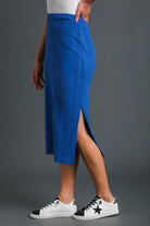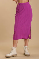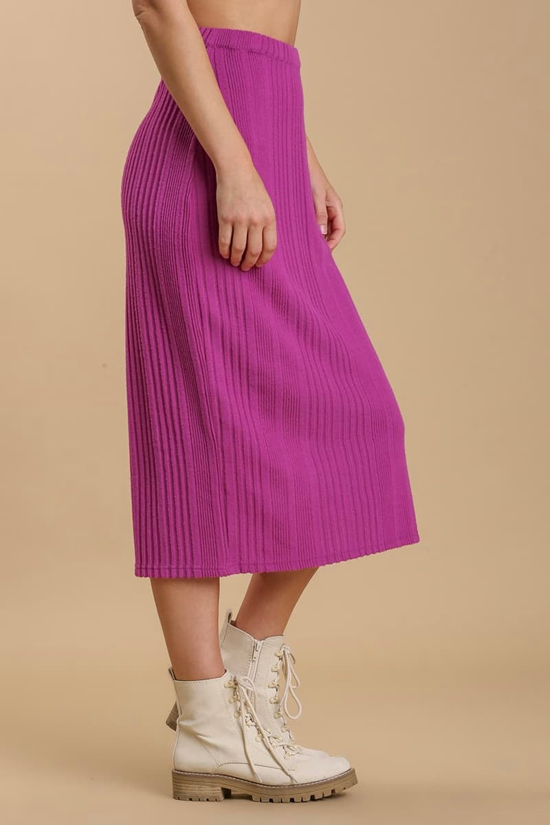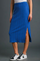 Effortlessly sleek and endlessly versatile — this ribbed knit midi skirt is the perfect mix of comfort and polish. Designed with a stretchy elastic waistband for an easy fit and a side slit for a subtle hint of movement and style. The midi length gives it that elevated, everyday elegance you’ll reach for again and again.