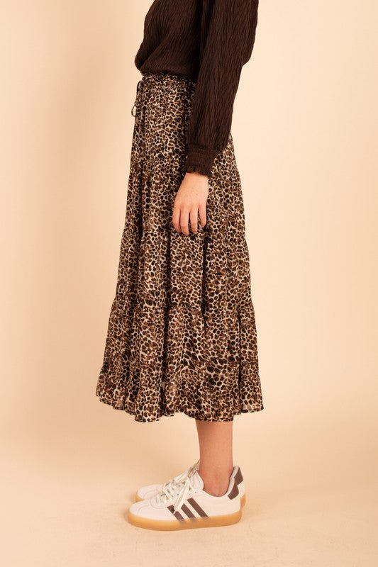 An animal print maxi skirt designed with both style and comfort in mind. Featuring a breezy silhouette with a flattering drawstring and elastic waist, this skirt is as versatile as it is chic. The bold print makes it a standout piece for fall, yet its lightweight flow and timeless design let you wear it year-round—pair it with sweaters and boots in cooler months or tanks and sandals in warmer weather. A true closet staple you’ll reach for in every season.