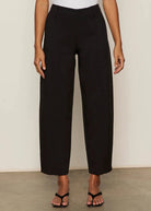 Meet your new go-to pants—designed with a semi high rise and a relaxed fit for all-day comfort and style. The modern black barrel leg shape adds a fresh, fashion-forward silhouette, while the stitch-through waistband and stretch center seam detail offer subtle structure and shape. A clean hook-and-bar closure keeps things polished, and two front side seam pockets add just the right amount of function. Effortless, tailored, and versatile—these are made for dressing up or keeping it casual.