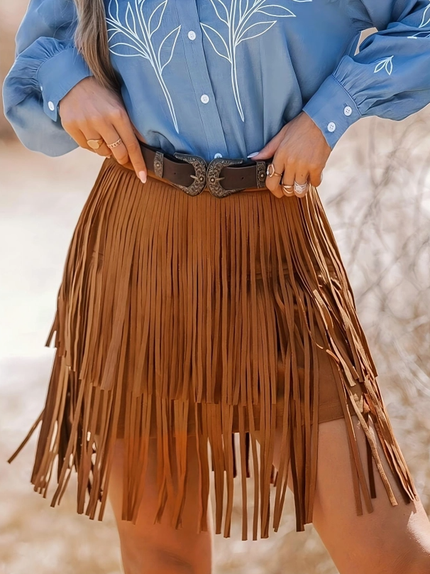 Channel effortless Western charm with this brown faux suede fringe mini skirt — a statement piece that combines playful movement with rustic sophistication. Crafted from soft, suede-like fabric, this skirt features layered fringe detailing that sways gracefully with every step, adding texture and attitude to your look.
