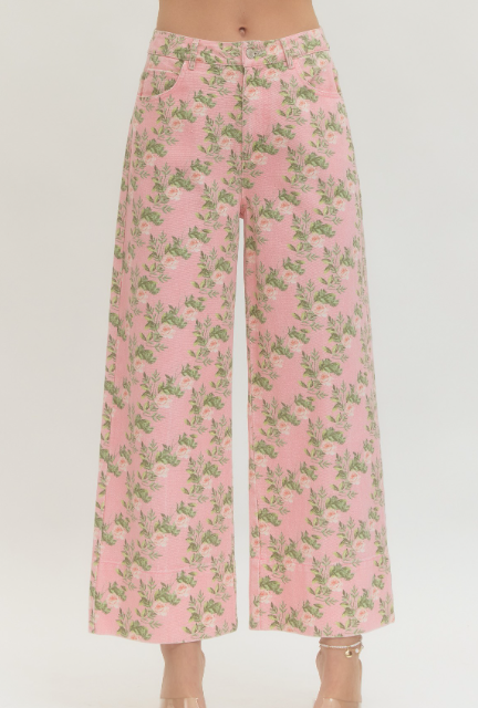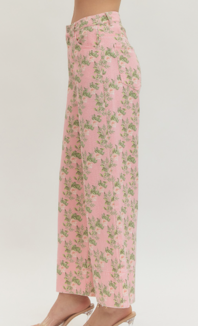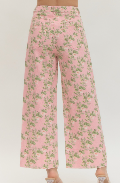 These statement wide leg pants feature a soft pink base accented with a delicate floral print for a feminine, eye-catching look. Designed with a flowy silhouette, they offer effortless movement and all-day comfort while still feeling polished. The high-rise waist creates a flattering fit, making them perfect to pair with fitted tops, blouses, or lightweight knits. Whether styled casually or dressed up, these pants bring a romantic touch to any outfit.