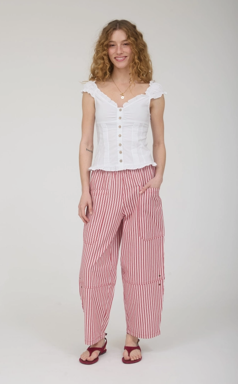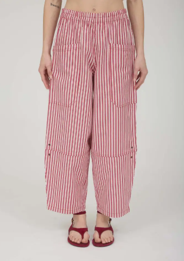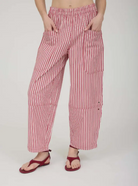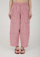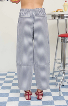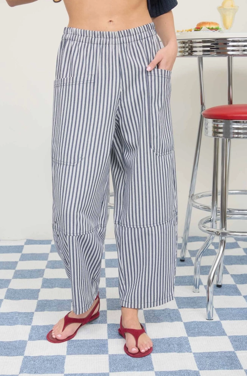 These striped mid-rise bottoms are designed for effortless comfort with a polished, casual feel. Featuring an elastic waistband for an easy, flexible fit, they’re finished with functional front patch pockets for everyday practicality. A subtle grommet detail at the front adds a modern touch, elevating the classic striped design. Easy to style and comfortable to wear, these bottoms are perfect for relaxed days, travel, or casual outings.