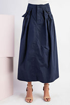 This solid maxi skirt is a standout staple with subtle, elevated details. Featuring a hook and eye closure and belt loop accents, it’s designed with delicate pinching throughout for added texture and charm. The loose-fit silhouette offers comfort and effortless movement, making it perfect for dressing up or down. Available in bold hot pink or classic navy—your new go-to for easy elegance.