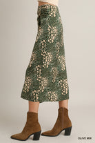 Elevate your everyday style with this olive green midi skirt, featuring a delicate cream-colored pattern for a timeless, feminine touch. Falling gracefully to the shin, it offers a flattering silhouette that’s both easy to wear and effortlessly chic.