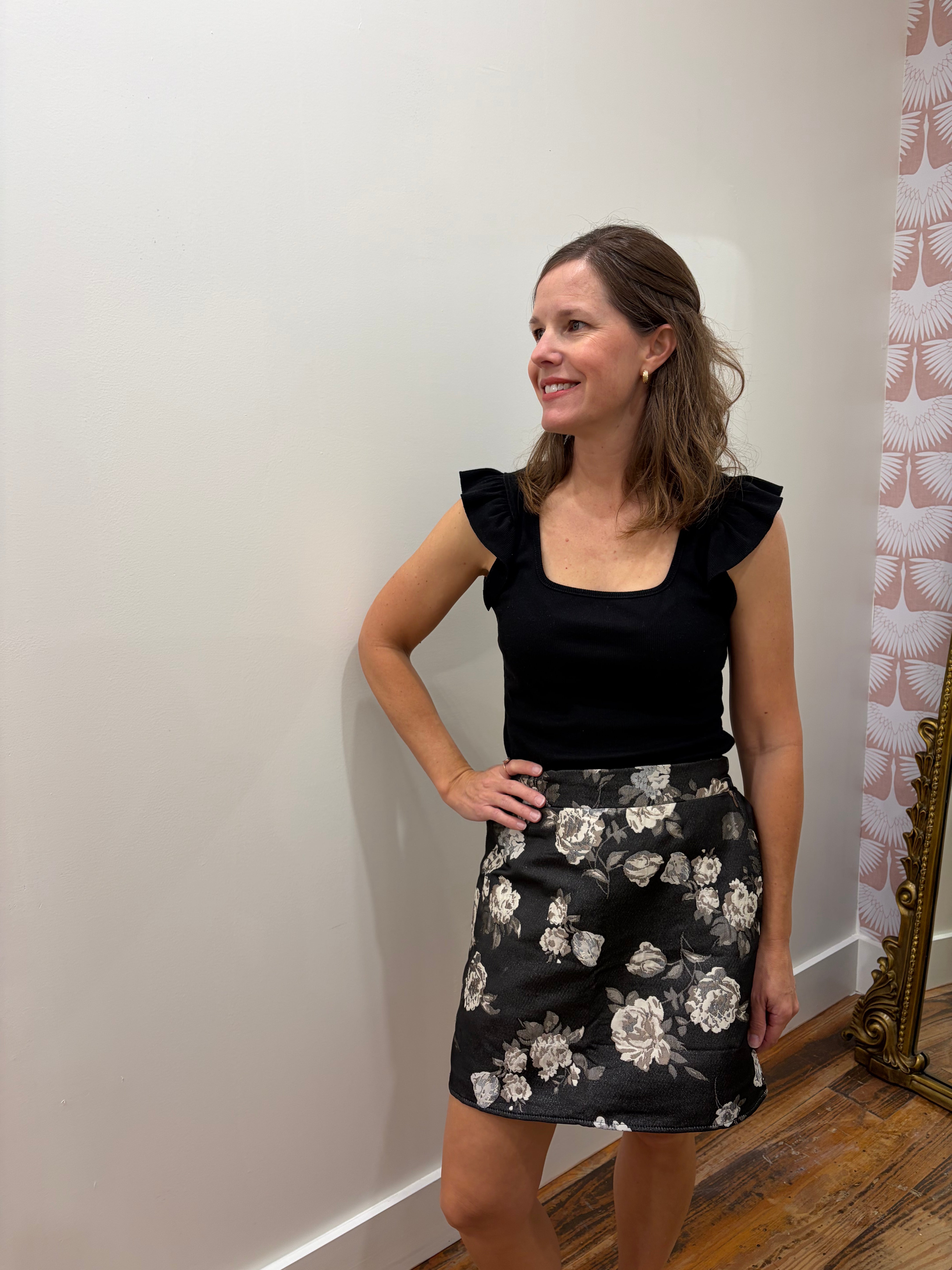 Introducing our Woodland Skirt, a versatile addition to your wardrobe. Crafted from a soft black fabric, this mini skirt features intricate metallic silver and black flowers, adding a touch of elegance to any outfit. Perfect for a day at the office or a night out, this skirt is a must-have for any fashion-forward individual.