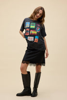 Fit for the well-traveled Deadheads, a collection of Grateful Dead backstage passes featuring the group's most recognized iconography is scattered on this acid wash Merch Tee.