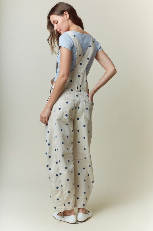 A playful twist on classic denim — these cream barrel overalls feature a charming navy polka dot print that gives them a fun, vintage-inspired feel. Crafted from soft, structured denim, they have a relaxed barrel leg silhouette for a modern, on-trend shape. Adjustable shoulder straps, functional pockets, and side button closures keep them practical yet effortlessly stylish.