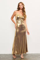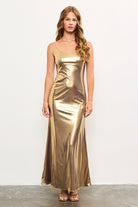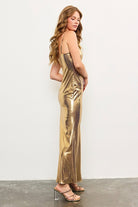 Turn up the glam with this metallic foil strap long dress that’s made to shine as bright as you do! The shimmering fabric catches the light with every move, and the delicate straps add a touch of sleek sophistication. The long silhouette is perfect for making an entrance, whether you’re at a gala, a fancy night out, or dancing under the stars.