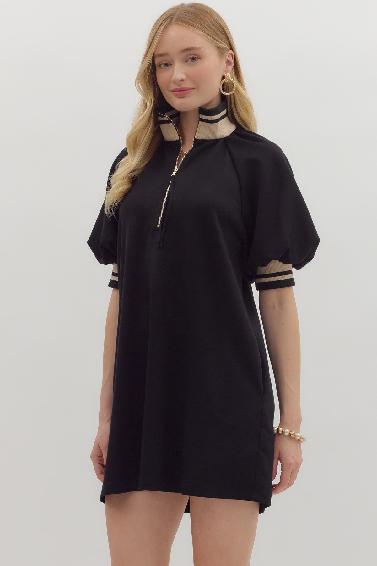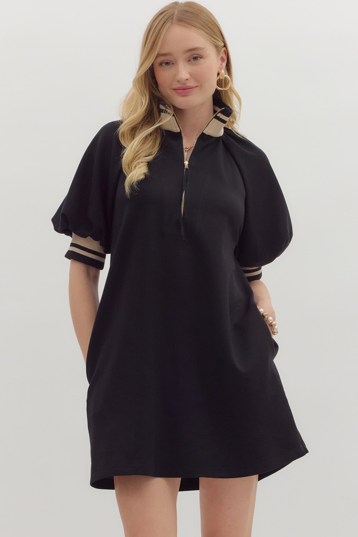 Solid mini dress with front zipper and multicolor ribbed trim. Side pockets. Unlined. Knit. Non-sheer. Lightweight.