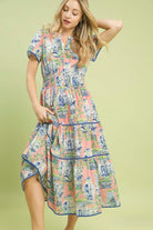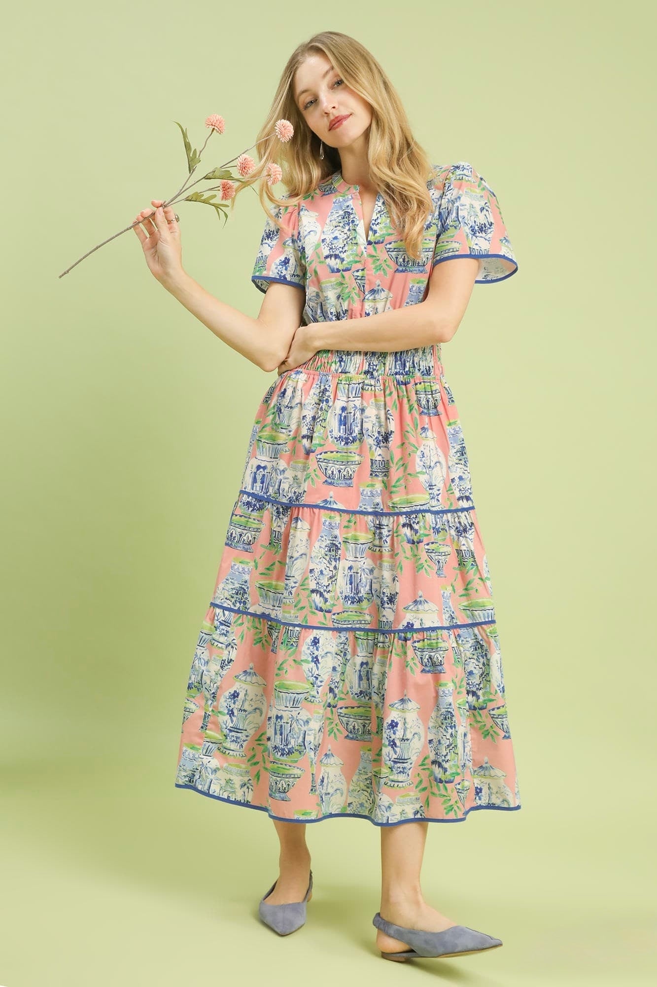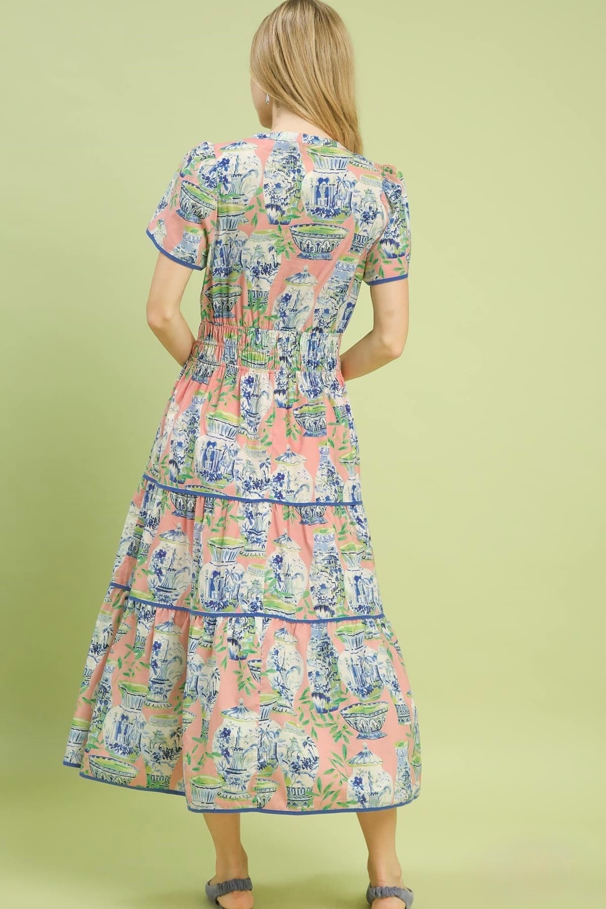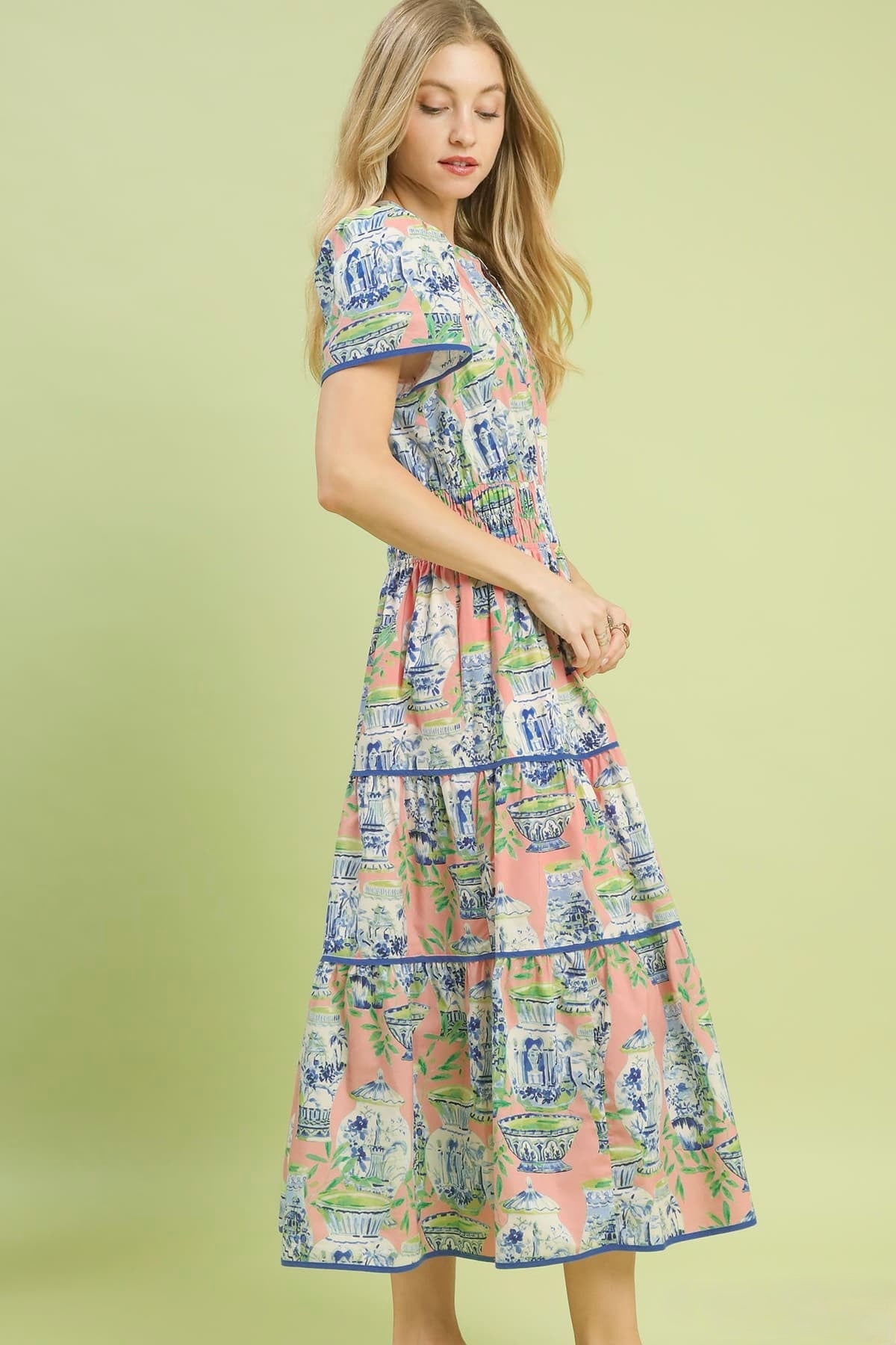 The split neckline and short puff sleeves bring a romantic touch, while a smocked waist ensures a flattering, comfortable fit. The tiered midi skirt flows effortlessly, enhanced with contrast piping that highlights each tier. Finished with skirt lining for easy, confident wear.