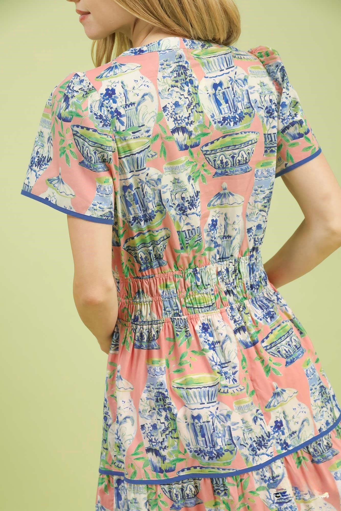 A statement piece that feels like wearable art, the Abstract Print Tiered Midi Dress blends soft femininity with a bold, curated print. Featuring a unique abstract vase and leaf motif, this dress stands out beautifully in any setting—from brunch dates to boutique events.