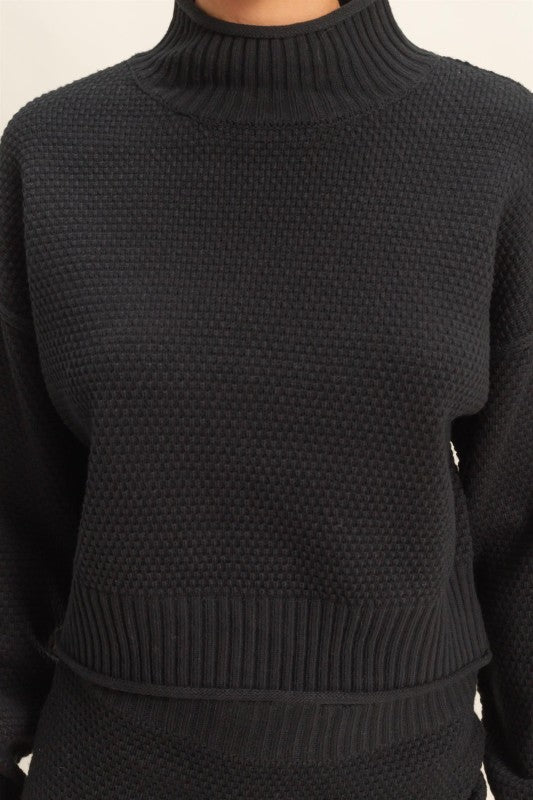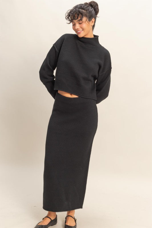 A textured high neck knit sweater with a matching long skirt brings effortless elegance to your fall and winter wardrobe. The sweater features a high neckline that gives it a polished, sophisticated vibe while the textured knit adds depth and dimension. Pairing seamlessly, the matching long skirt creates a sleek, put-together silhouette that elongates the body.