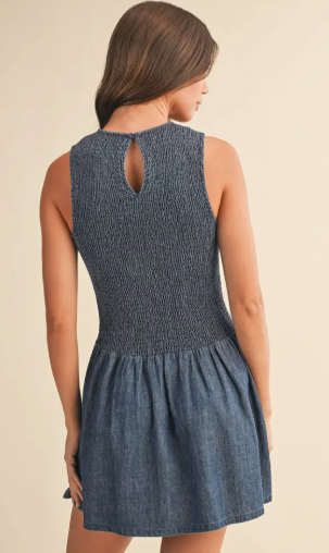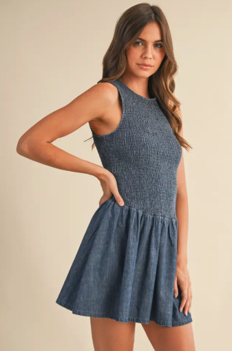 This Bluebell Smocked Denim Mini Dress blends casual charm with a flattering, feminine silhouette. Crafted from denim, it features a smocked bodice that hugs comfortably while enhancing shape. The sleeveless cut keeps it light and versatile, and the flared mini skirt adds movement and a playful finish. Easy to dress up or down, this piece is perfect for warm days, weekend outings, or casual nights out.