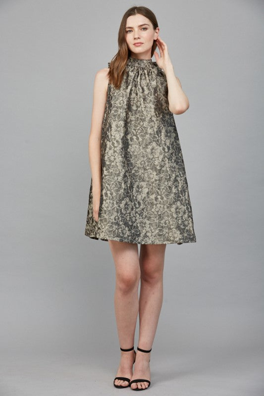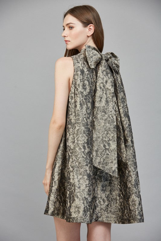 An olive floral jacquard mini dress that exudes timeless elegance. Crafted in a rich floral pattern with subtle texture, this dress features a sophisticated high neckline adorned with a self-tie bow that fastens at the back and cascades gracefully down. The chic mini silhouette strikes the perfect balance of refined and flirty, making it a standout statement for any occasion.