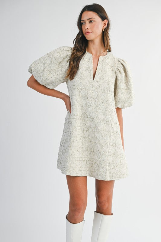 Elegant textured tweed mini dress in a stunning champagne hue, featuring dramatic puff sleeves for that bold, feminine flair. ✨ The structured silhouette and luxe tweed fabric give it a timeless, high-end feel — perfect for holiday parties, weddings, or any event where you want to shine. Pair it with heels and statement earrings for a chic, polished look that turns heads. 🥂🤍