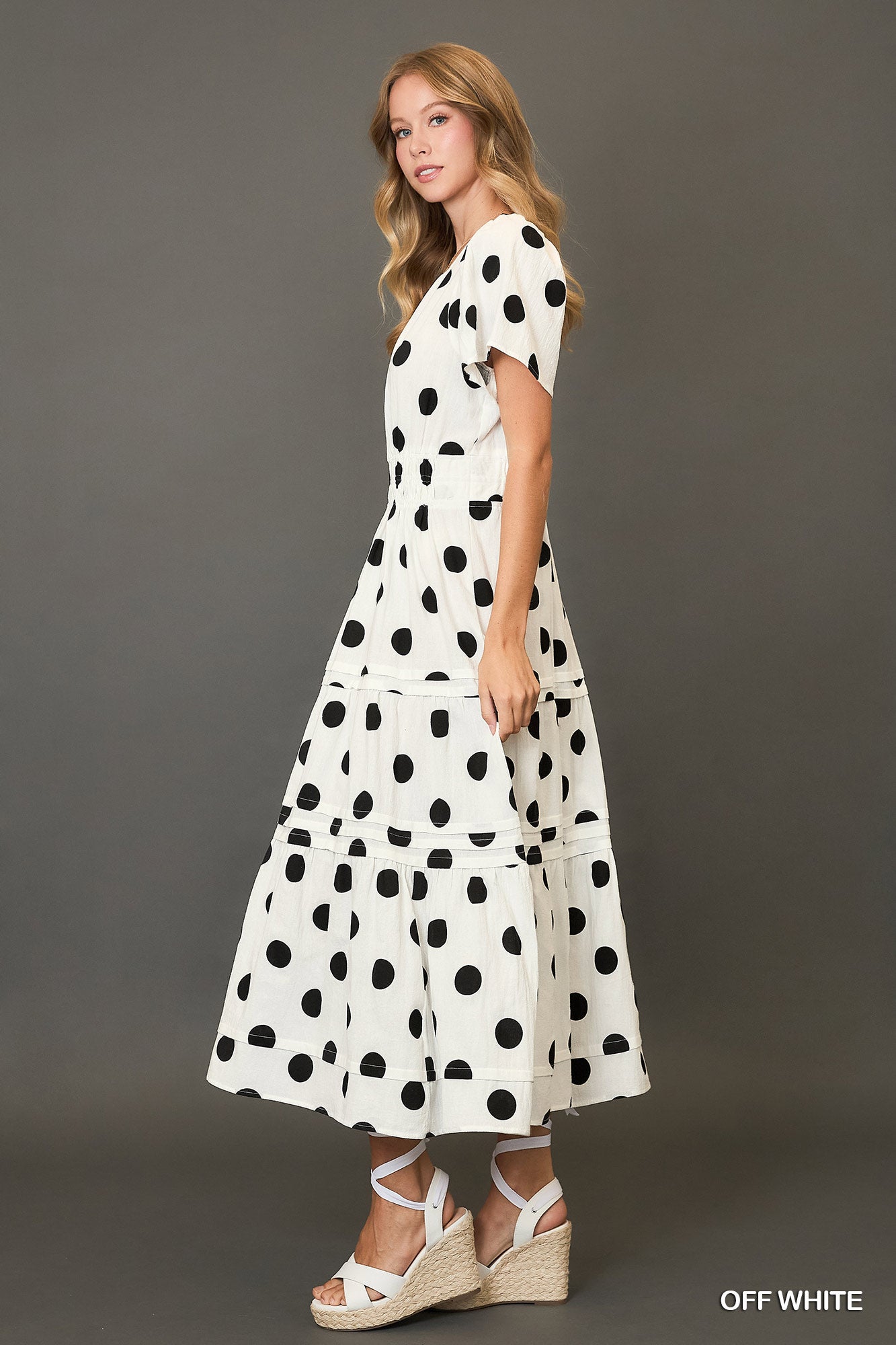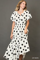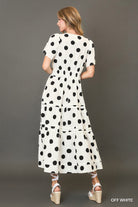 Classic and charming, this white ankle-length dress is adorned with timeless black polka dots for a playful yet sophisticated look. Designed with short sleeves and a flowing silhouette, it moves beautifully with every step — perfect for sunny days, weekend outings, or a chic evening out.