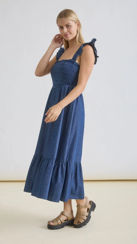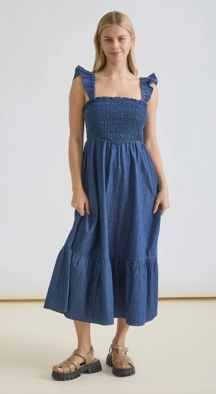 Effortlessly chic with a touch of romance, this dark denim midi dress is a standout staple for any season. Crafted from soft, breathable denim, it features a flattering smocked bodice that hugs comfortably while offering stretch and ease of movement.