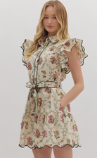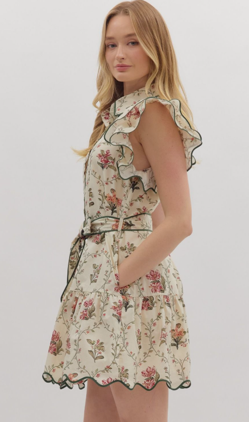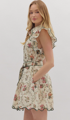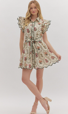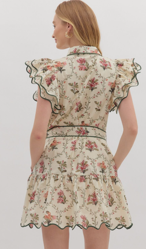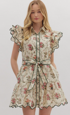 Feminine and charming, the Garden Grace Mini is made for moments that feel like sunshine. This black floral print dress features flutter sleeves, a tiered skirt, and a flattering self-tie belt at the waist. Detailed with scalloped contour accents and delicate piped trim along the collar, placket, sleeves, belt, and hem, every inch feels special. A shirt collar, button-front closure, and side pockets keep it effortless, while the lined finish ensures comfort. Perfect for a garden party or any occasion where you want to look cute, polished, and oh-so-feminine.