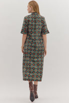 A standout statement with effortless charm — this geometric print short sleeve midi dress features a front button closure and handy side pockets for that perfect mix of style and function. Crafted in a lightweight woven fabric and fully lined for a smooth fit, it flows beautifully while keeping you cool and comfortable.