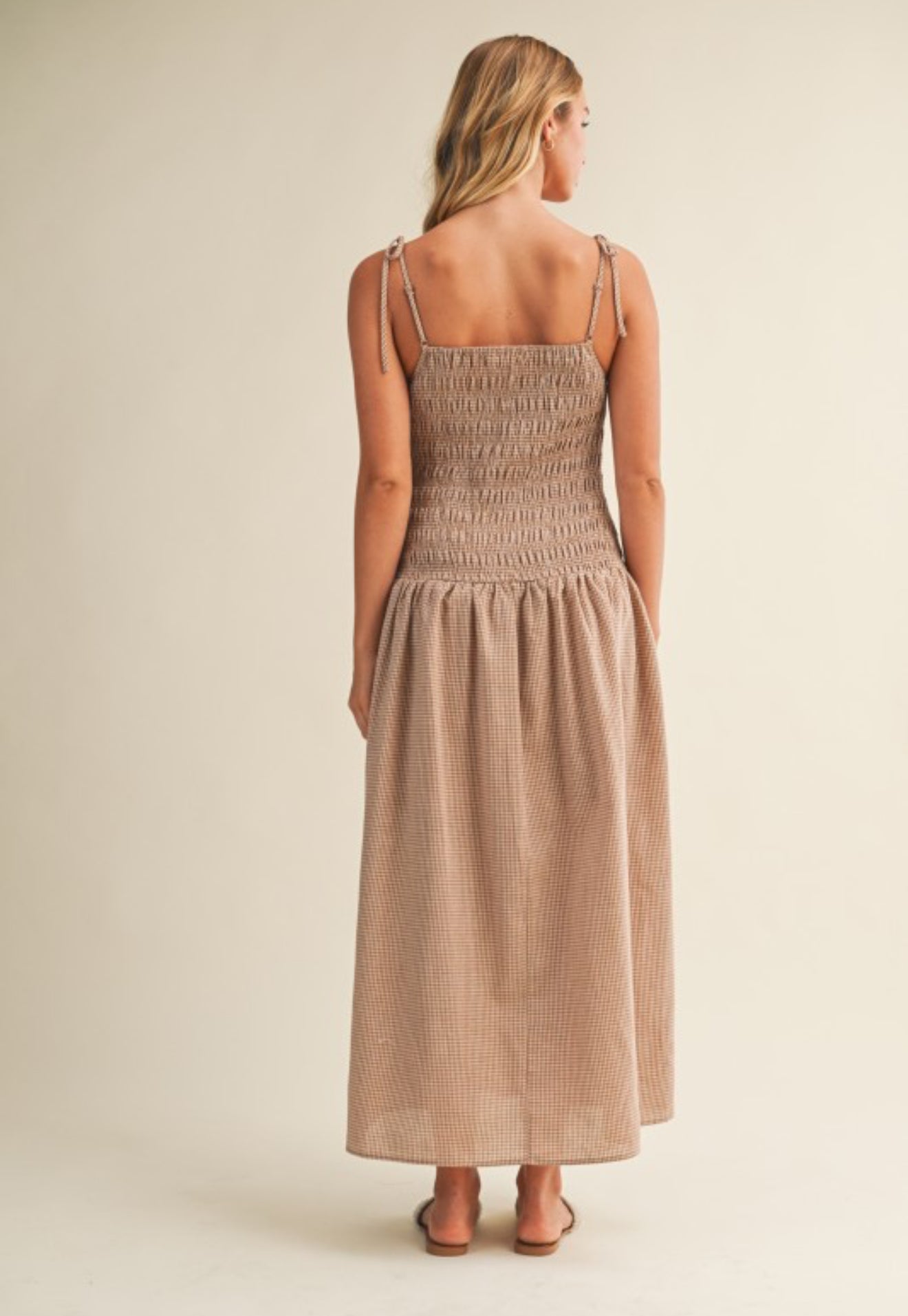 The flowing maxi-length skirt creates a flattering silhouette with beautiful movement, while the soft gingham pattern in a light chocolate hue gives it that classic-with-a-twist feel. Easy to dress up or down, this is the kind of dress you’ll reach for all season long.