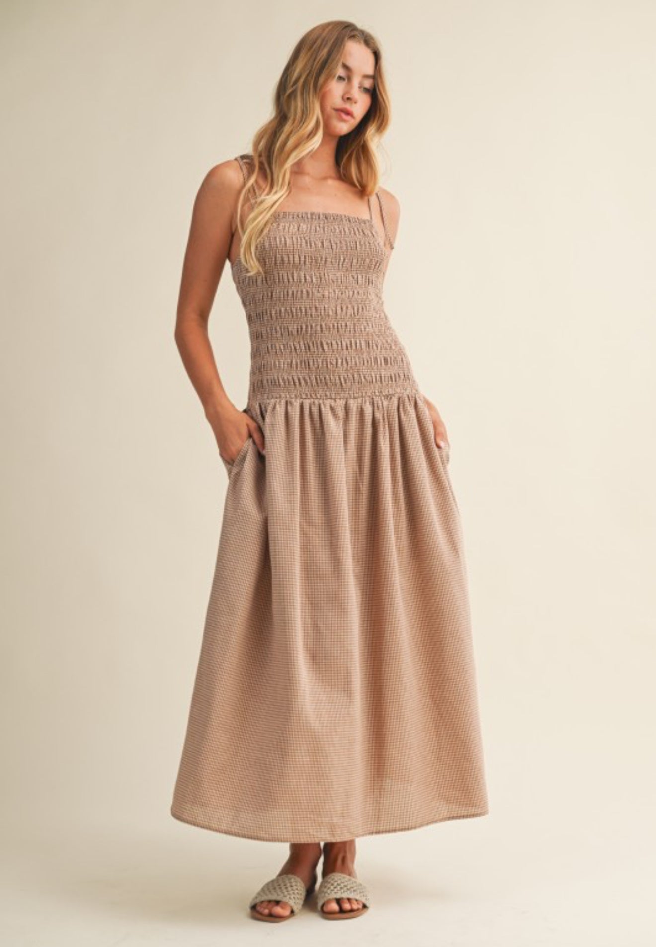 This light chocolate gingham maxi dress is an effortless blend of comfort and timeless style. Designed with a fully smocked bodice, it hugs just right while offering an easy, flexible fit that moves with you. Delicate spaghetti straps add a feminine touch, keeping the look light, airy, and perfect for warm days.