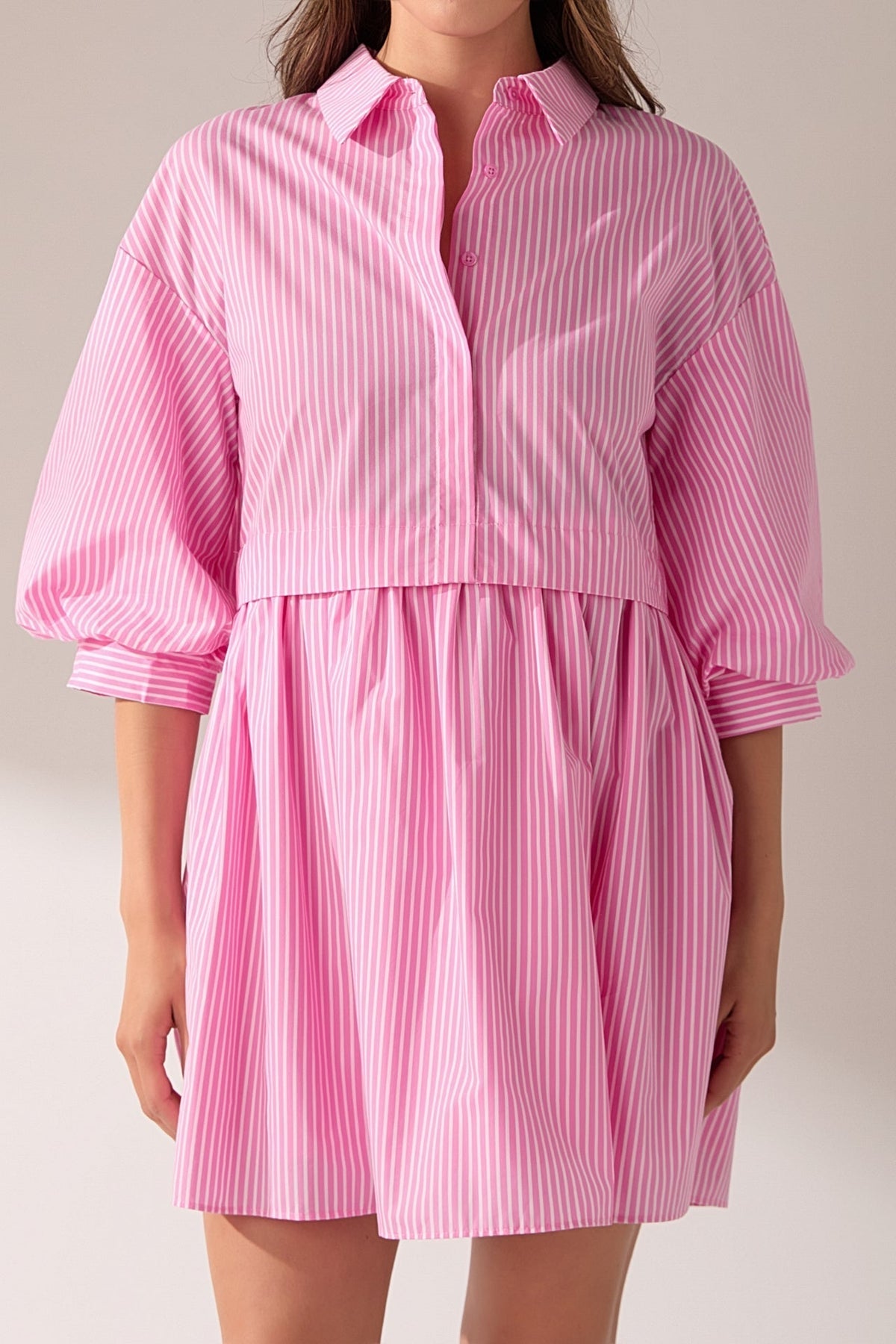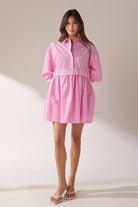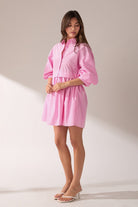 Pretty in pink and effortlessly polished, this striped mini dress is the definition of cute-meets-classic. It features a crisp collared half placket that gives it a tailored touch, while the puffed elbow sleeves add a soft, feminine silhouette. The front button closure keeps the look clean and easy, and the mini length brings the perfect amount of flirty fun. Fully lined for comfort and confidence, this dress is a go-to for brunch, strolling the shops, or any day you want to feel sweet and stylish without trying too hard.