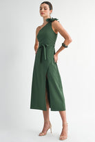 Turn heads this season in our stunning green one-shoulder midi dress. Designed with a flattering side slit and a slim tie bow belt to accentuate the waist, this piece balances elegance and edge. The detachable corsage adds a playful, feminine touch—wear it for extra drama or remove it for a sleek, minimalist vibe.