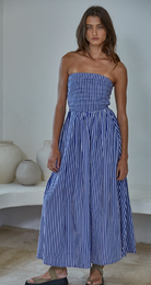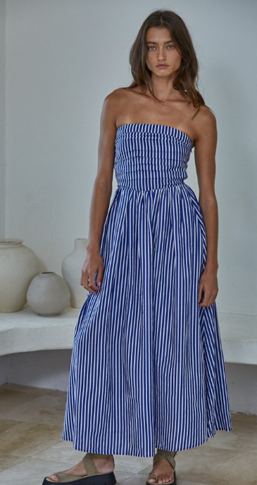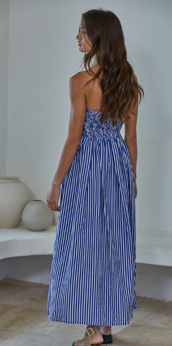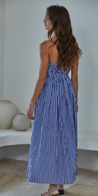 The smocked bodice provides a secure, flexible fit that hugs comfortably before flowing into a full-length skirt. Vertical stripes add a timeless touch and help elongate the look, making this dress perfect for warm-weather outings, vacations, or casual events where style meets ease.