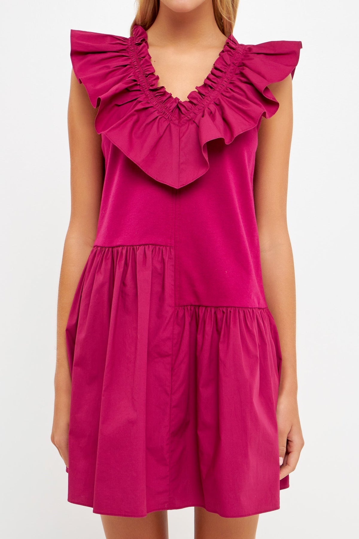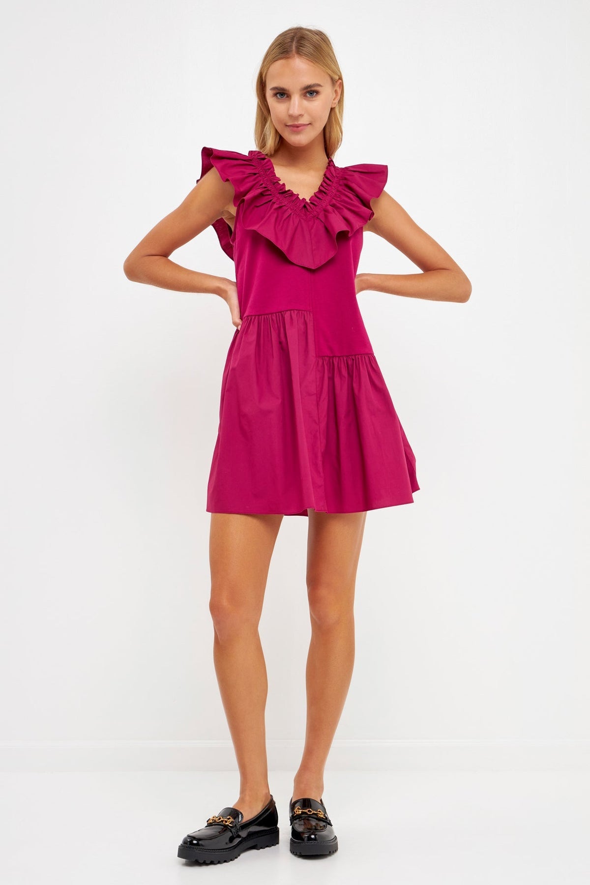 Feel effortlessly stylish in this chic mixed media mini dress, designed with a blend of soft knit and airy woven fabric for the perfect balance of comfort and structure. The ruffled neckline adds a feminine, elevated touch that instantly sets it apart, while the easy mini length keeps it playful and wearable for every day. Simple to care for—just hand wash cold—this dress is one you’ll reach for again and again. A go-to piece that feels both special and effortless.