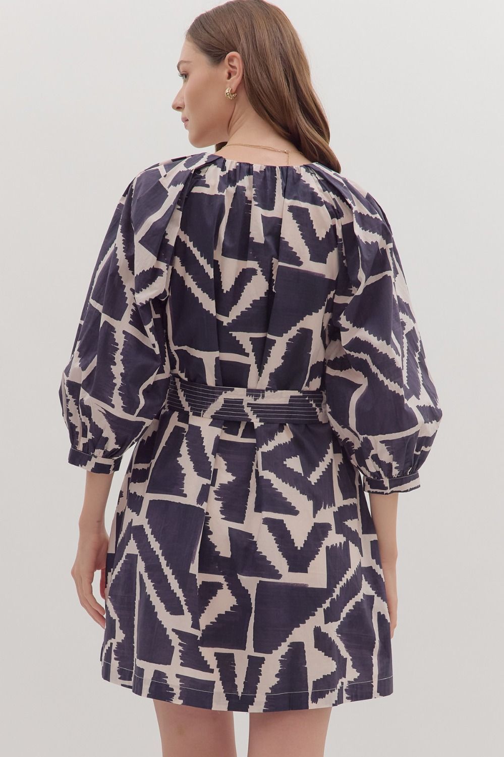 Bold meets effortless in this geometric print mini dress. Designed with 3/4 sleeves and a front zipper closure, it brings a modern edge to a classic silhouette. The self-tie waist belt flatters your shape, while the lightweight woven fabric keeps it breezy and comfortable. Fully lined, non-sheer, and easy to wear, this dress is your go-to for standout style with everyday ease.