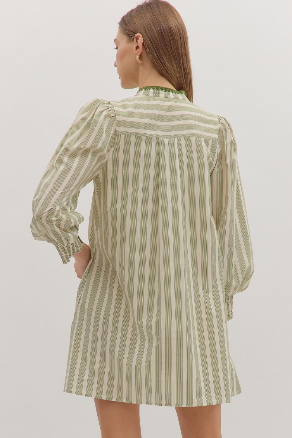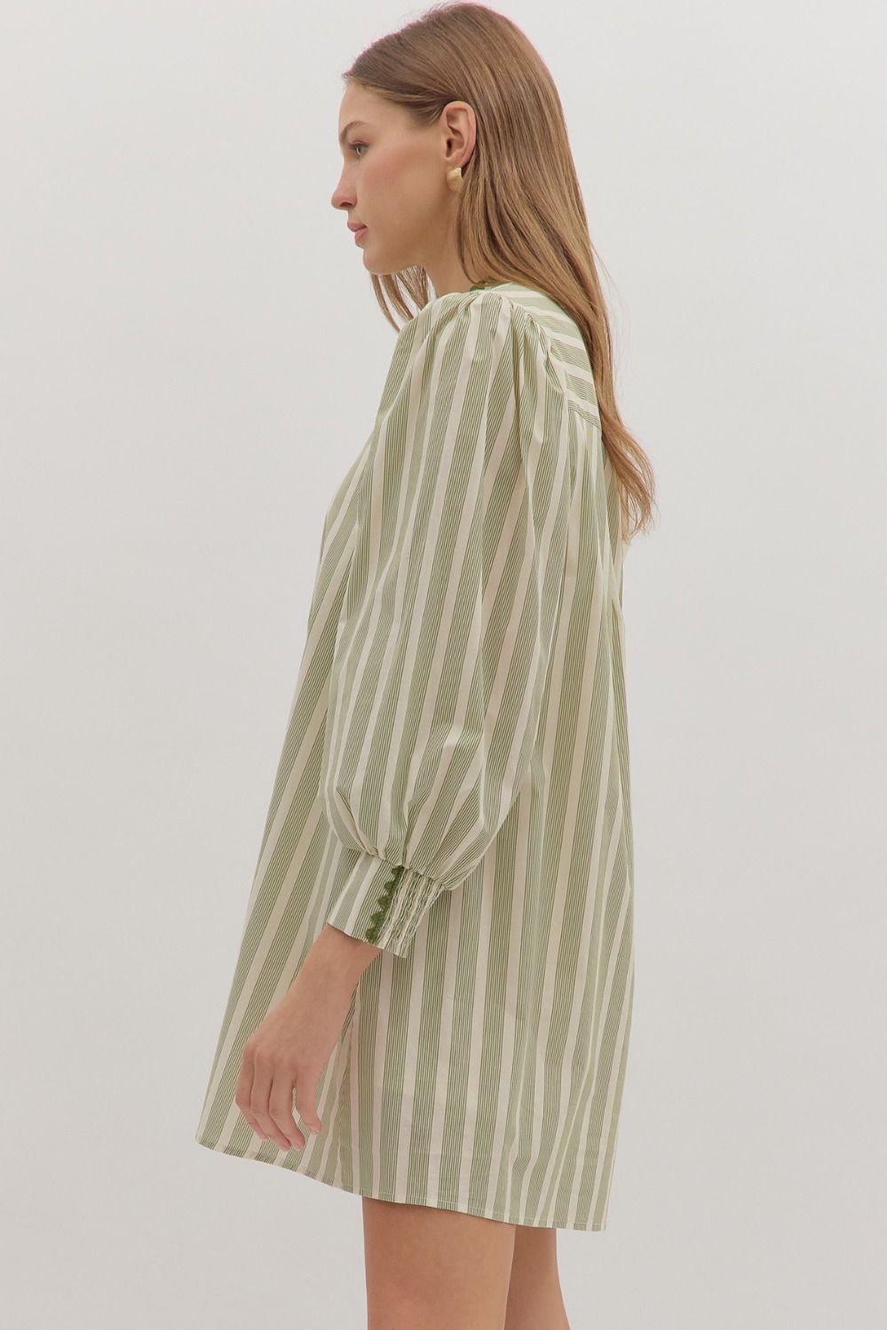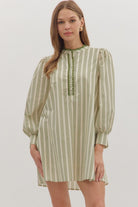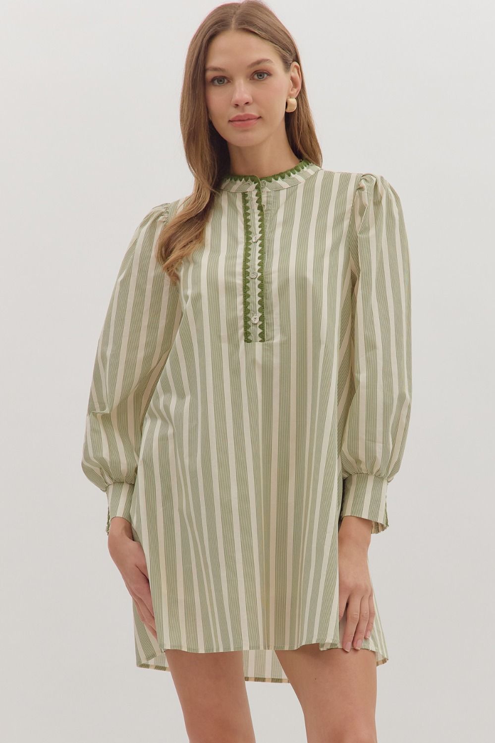 Feminine charm meets timeless detail in this stripe long puff sleeve mini dress. Featuring delicate lace trim along the front, functional button closure, and side pockets for everyday ease. Fully lined in a lightweight woven fabric, this beauty blends effortless comfort with classic sophistication.